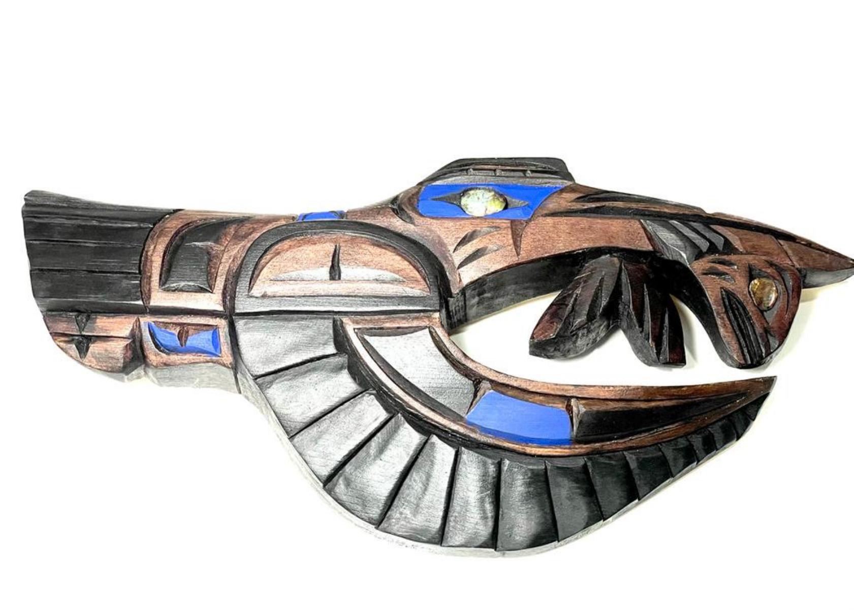 West Coast Native King Fisher Hunting Fish.....hard carved red ceder....By First nation artist Geroge Nookamus ; Size 13 inches.