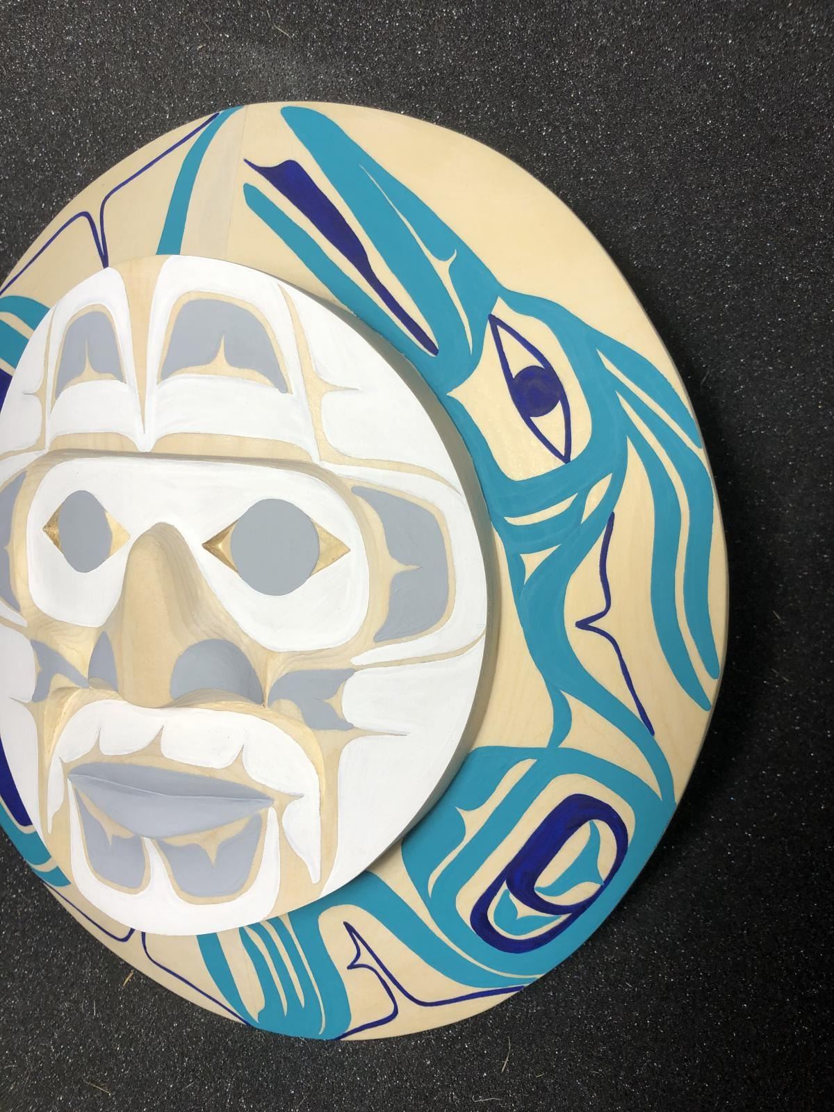 West Coast Native Moon Mask with Blue Heron Spirit........10 inches size.....Hand Craved on the yellow cedar by First Nation Artist Russell Tate......Russell Tate from the Ditidaht First Nation on the southwest coast of Vancouver Island. He started carving in 2004, artists such as Art Thompson and the artists on the Ravens and Eagles show inspired him. Russell learned how to wood carved mostly working on his own. He specializes in masks and paddles, but is now working on small poles and miniatures for regalia. Russell has worked with Ben David and Cecil Dawson, and has collaborated on several pieces with Cecil
