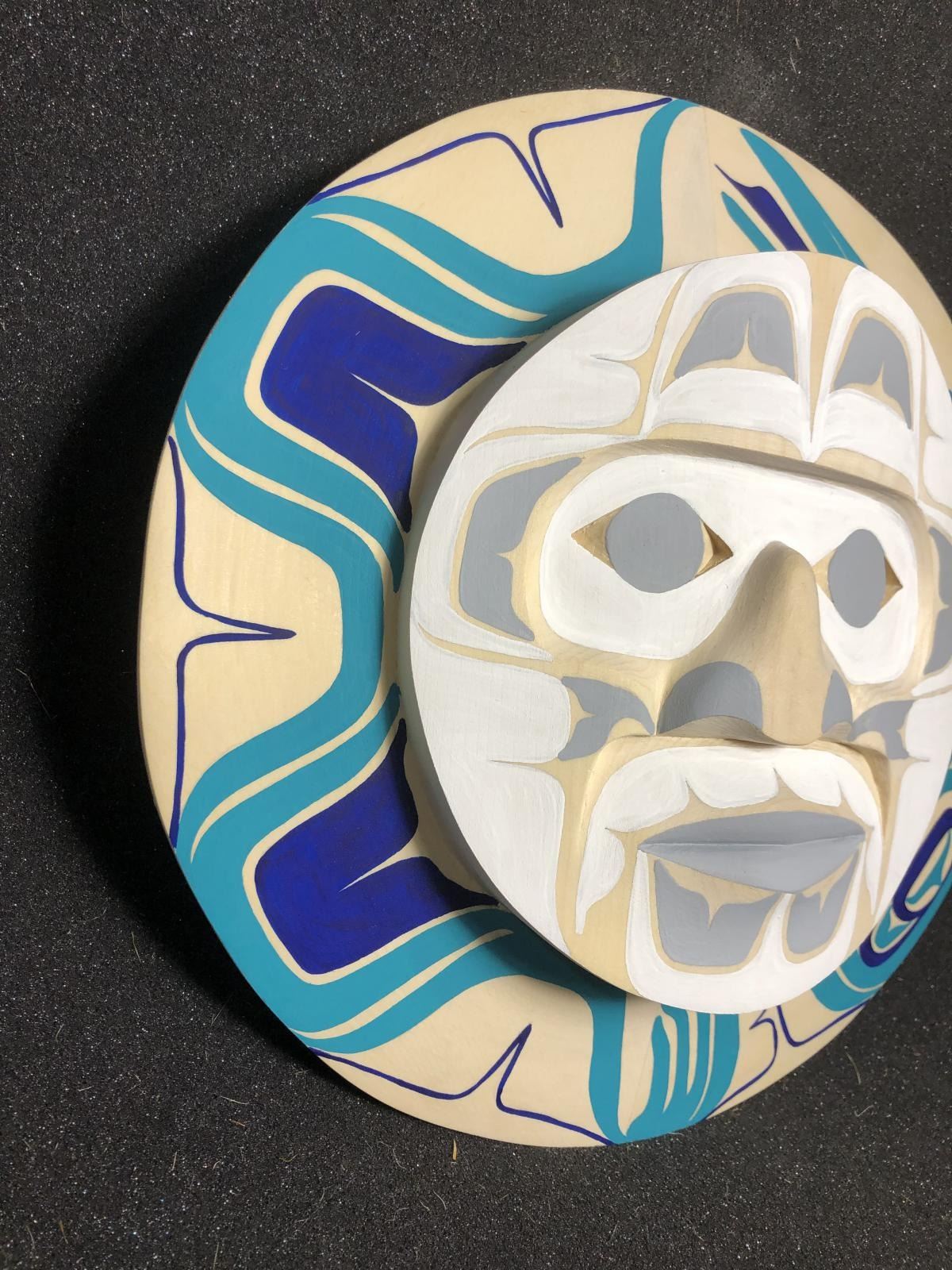 West Coast Native Moon Mask with Blue Heron Spirit........10 inches size.....Hand Craved on the yellow cedar by First Nation Artist Russell Tate......Russell Tate from the Ditidaht First Nation on the southwest coast of Vancouver Island. He started carving in 2004, artists such as Art Thompson and the artists on the Ravens and Eagles show inspired him. Russell learned how to wood carved mostly working on his own. He specializes in masks and paddles, but is now working on small poles and miniatures for regalia. Russell has worked with Ben David and Cecil Dawson, and has collaborated on several pieces with Cecil