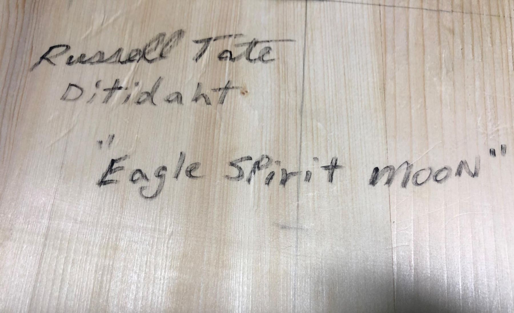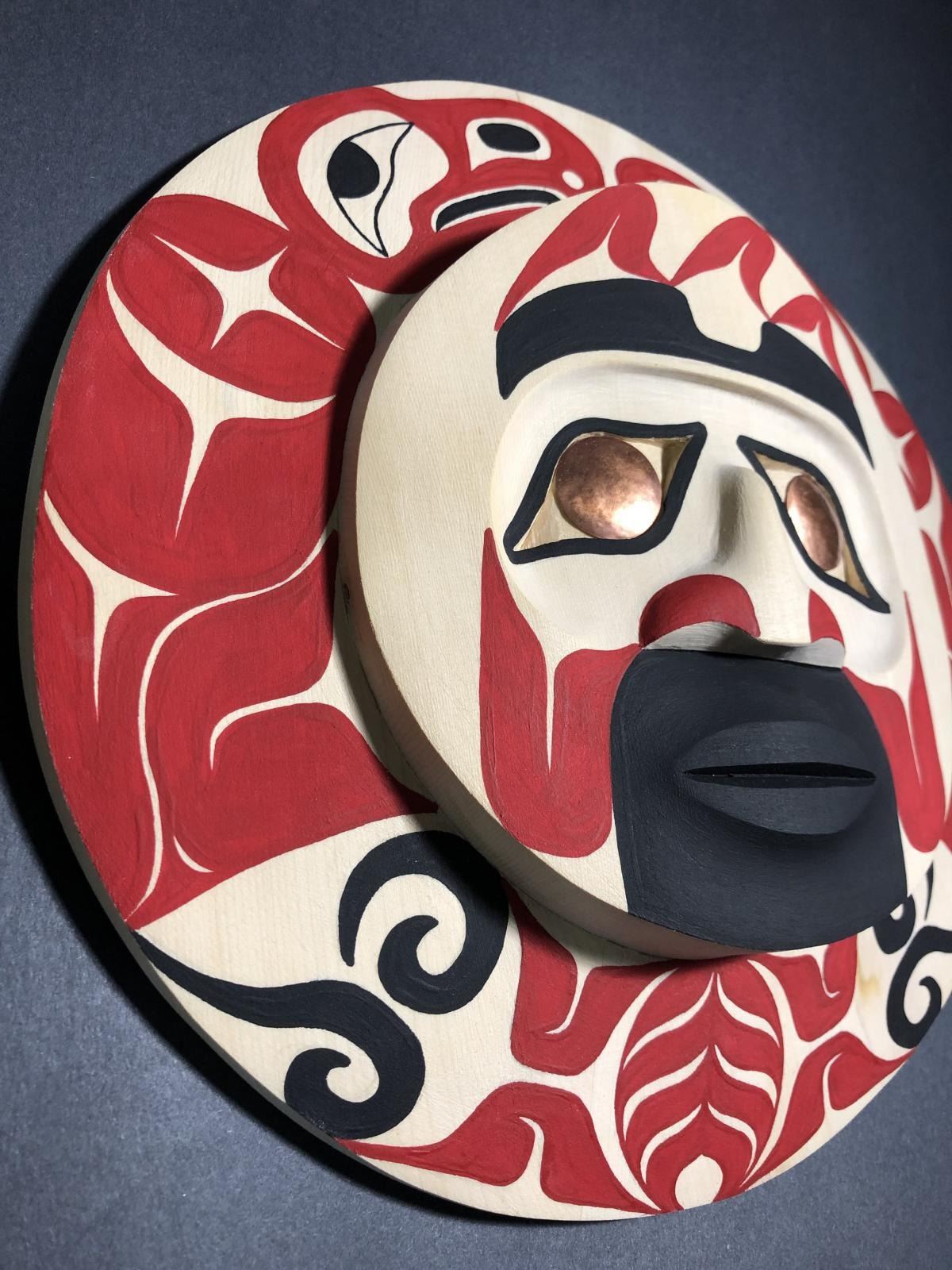 West Coast Native Moon Mask with Eagle Spirit........12 inches size.....Hand Craved on the yellow cedar by First Nation Artist Russell Tate......Russell Tate from the Ditidaht First Nation on the southwest coast of Vancouver Island. He started carving in 2004, artists such as Art Thompson and the artists on the Ravens and Eagles show inspired him. Russell learned how to wood carved mostly working on his own. He specializes in masks and paddles, but is now working on small poles and miniatures for regalia. Russell has worked with Ben David and Cecil Dawson, and has collaborated on several pieces with Cecil
