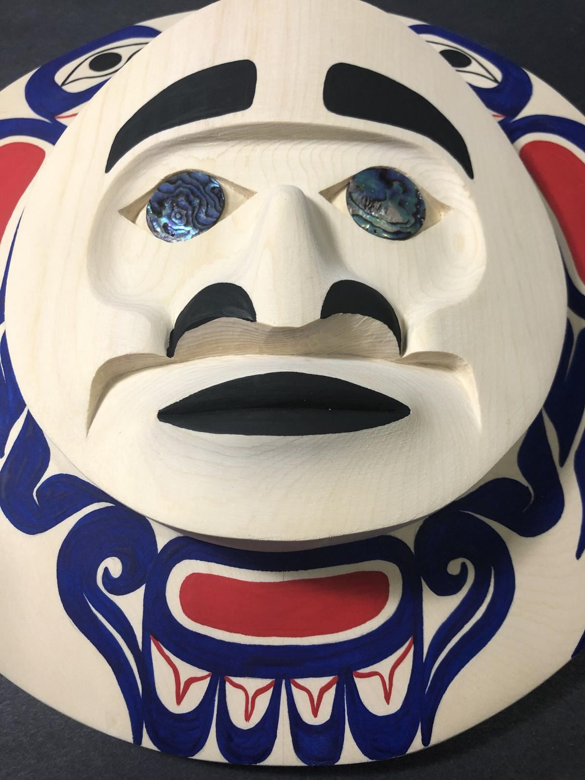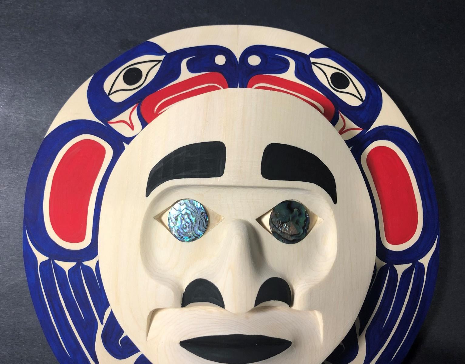 West Coast Native Moon Mask with Eagle Spirit........10 inches size.....Hand Craved on the yellow cedar by First Nation Artist Russell Tate......Russell Tate from the Ditidaht First Nation on the southwest coast of Vancouver Island. He started carving in 2004, artists such as Art Thompson and the artists on the Ravens and Eagles show inspired him. Russell learned how to wood carved mostly working on his own. He specializes in masks and paddles, but is now working on small poles and miniatures for regalia. Russell has worked with Ben David and Cecil Dawson, and has collaborated on several pieces with Cecil