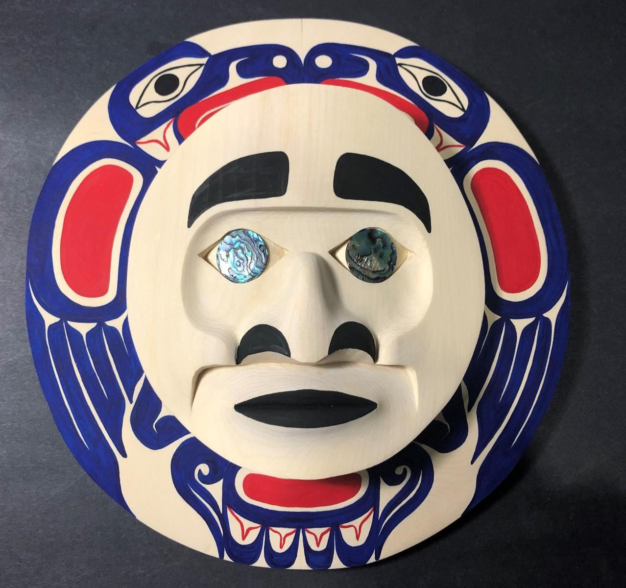West Coast Native Moon Mask with Eagle Spirit........10 inches size.....Hand Craved on the yellow cedar by First Nation Artist Russell Tate......Russell Tate from the Ditidaht First Nation on the southwest coast of Vancouver Island. He started carving in 2004, artists such as Art Thompson and the artists on the Ravens and Eagles show inspired him. Russell learned how to wood carved mostly working on his own. He specializes in masks and paddles, but is now working on small poles and miniatures for regalia. Russell has worked with Ben David and Cecil Dawson, and has collaborated on several pieces with Cecil