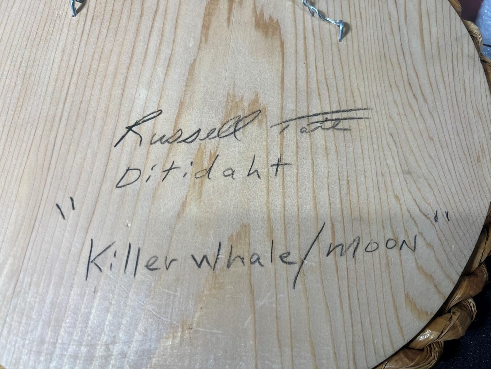 West Coast Native Moon Mask with Killer Whale Spirit; 10 inches size.....Hand Craved on the Red cedar by First Nation Artist Russell Tate......Russell Tate from the Ditidaht First Nation on the southwest coast of Vancouver Island. He started carving in 2004, artists such as Art Thompson and the artists on the Ravens and Eagles show inspired him. Russell learned how to wood carved mostly working on his own. He specializes in masks and paddles, but is now working on small poles and miniatures for regalia. Russell has worked with Ben David and Cecil Dawson, and has collaborated on several pieces with Cecil