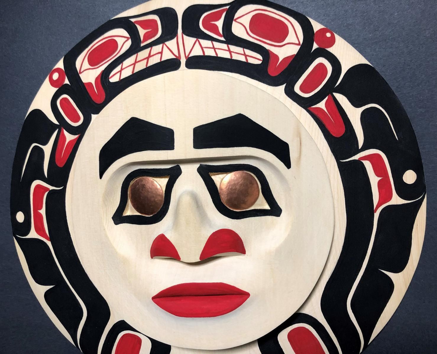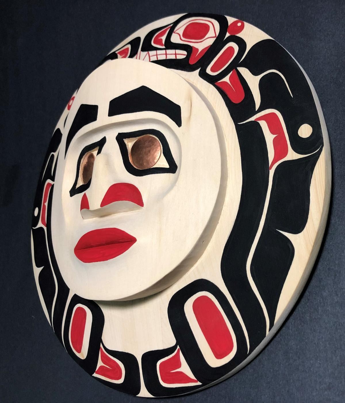 West Coast Native Moon Mask with Killer whale Spirit........12 inches size.....Hand Craved on the yellow cedar by First Nation Artist Russell Tate......Russell Tate from the Ditidaht First Nation on the southwest coast of Vancouver Island. He started carving in 2004, artists such as Art Thompson and the artists on the Ravens and Eagles show inspired him. Russell learned how to wood carved mostly working on his own. He specializes in masks and paddles, but is now working on small poles and miniatures for regalia. Russell has worked with Ben David and Cecil Dawson, and has collaborated on several pieces with Cecil