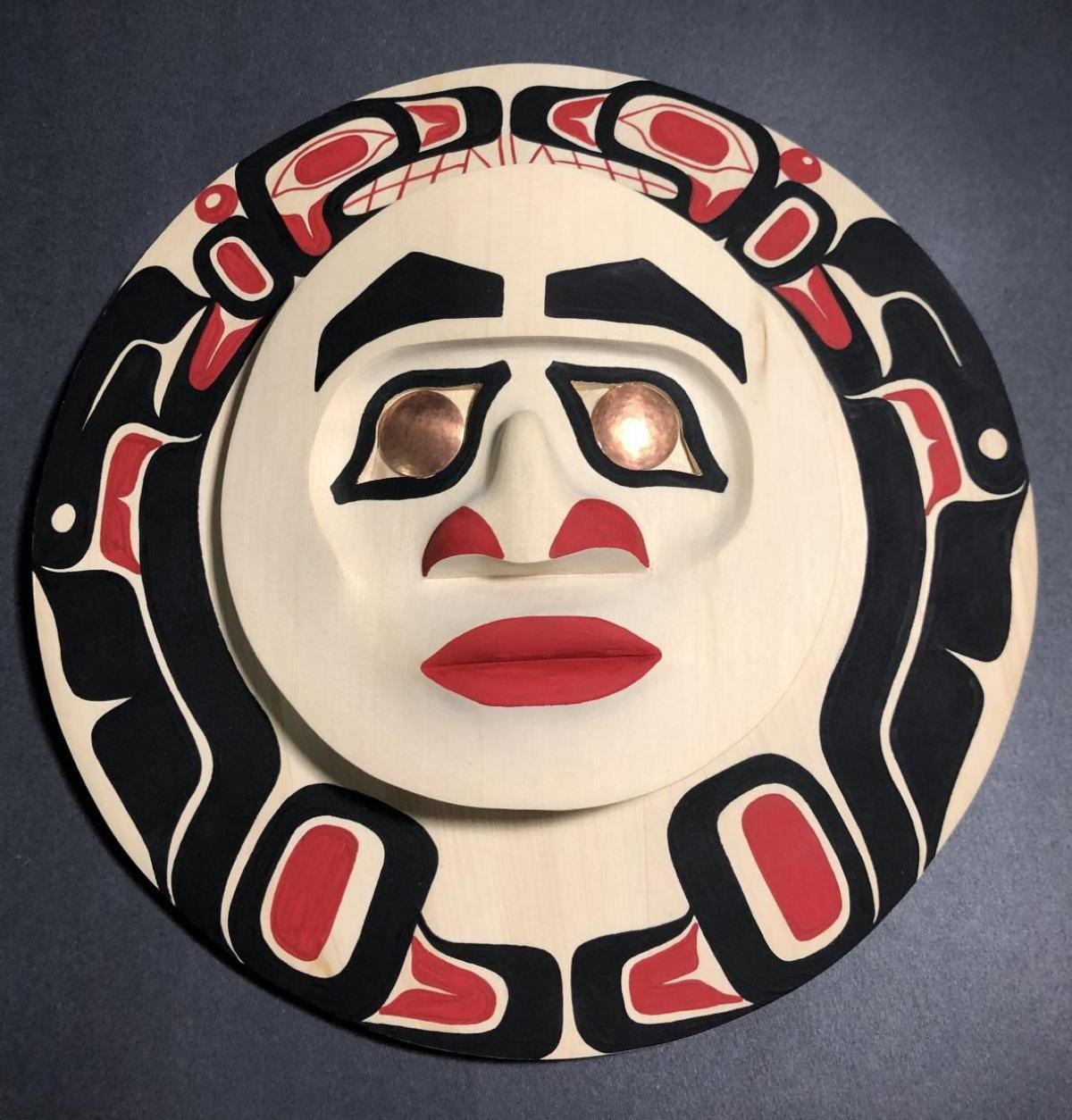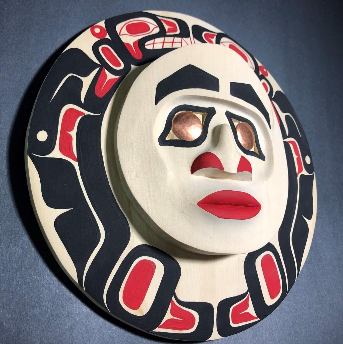 West Coast Native Moon Mask with Killer whale Spirit........12 inches size.....Hand Craved on the yellow cedar by First Nation Artist Russell Tate......Russell Tate from the Ditidaht First Nation on the southwest coast of Vancouver Island. He started carving in 2004, artists such as Art Thompson and the artists on the Ravens and Eagles show inspired him. Russell learned how to wood carved mostly working on his own. He specializes in masks and paddles, but is now working on small poles and miniatures for regalia. Russell has worked with Ben David and Cecil Dawson, and has collaborated on several pieces with Cecil