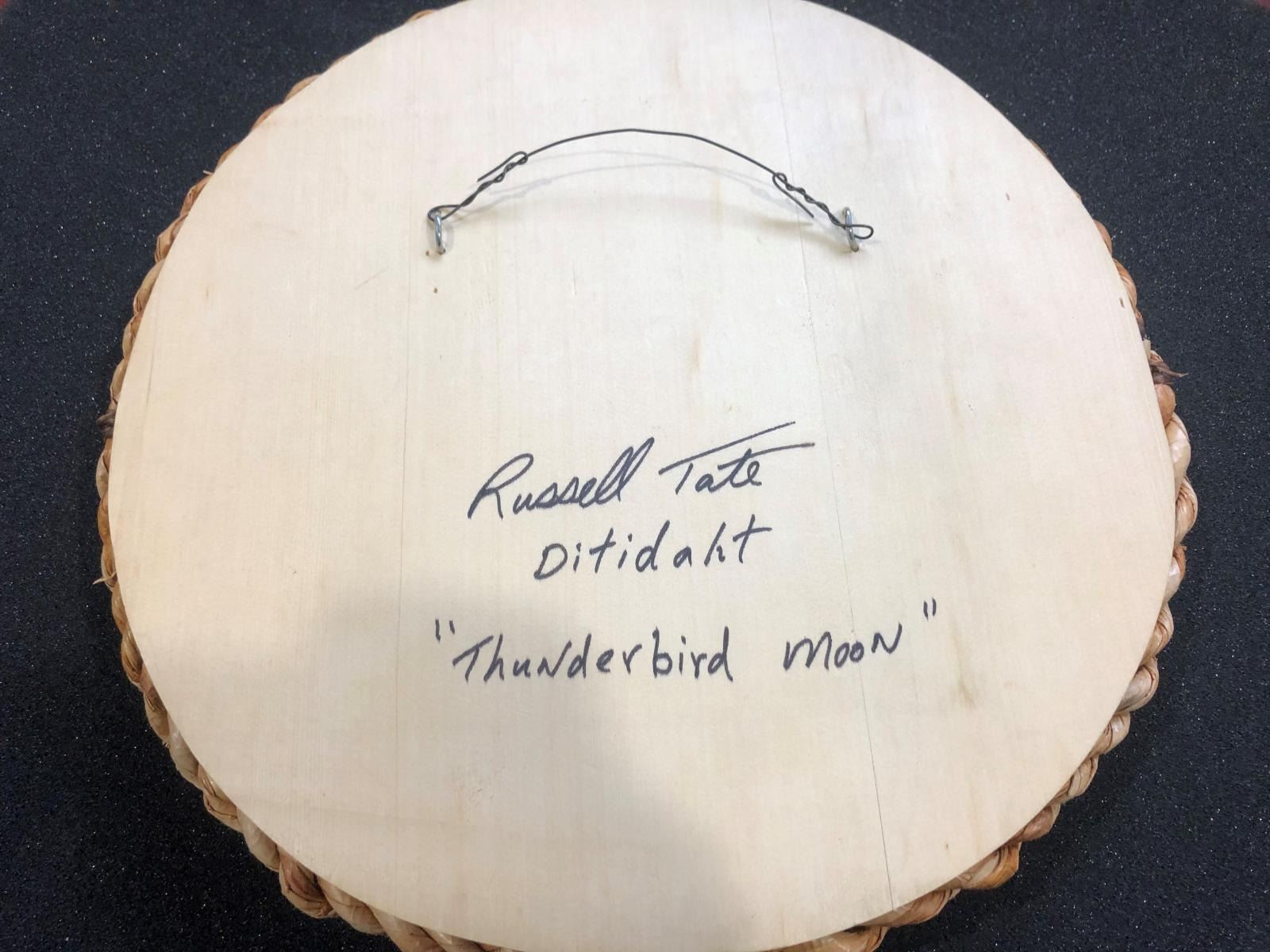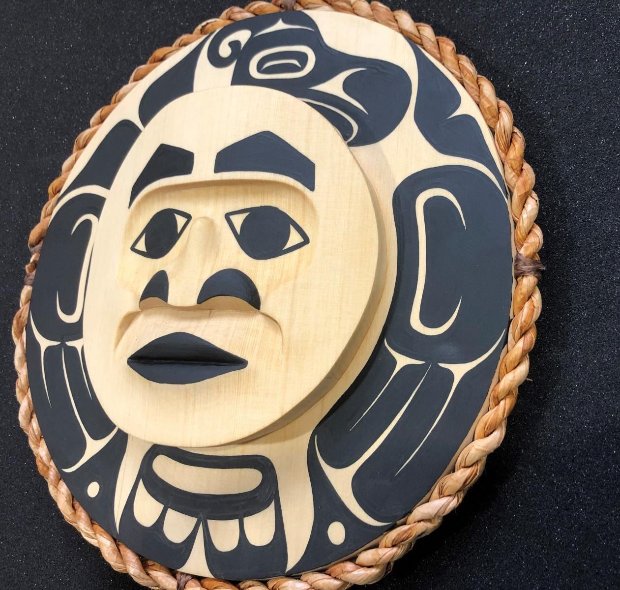 West Coast Native Moon Mask with Thunderbird Spirit........12 inches size.....Hand Craved on the yellow cedar by First Nation Artist Russell Tate......Russell Tate from the Ditidaht First Nation on the southwest coast of Vancouver Island. He started carving in 2004, artists such as Art Thompson and the artists on the Ravens and Eagles show inspired him. Russell learned how to wood carved mostly working on his own. He specializes in masks and paddles, but is now working on small poles and miniatures for regalia. Russell has worked with Ben David and Cecil Dawson, and has collaborated on several pieces with Cecil