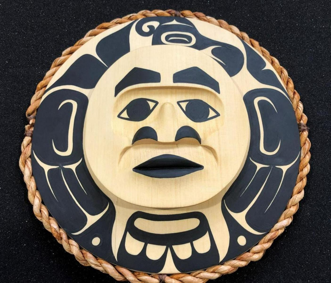 West Coast Native Moon Mask with Thunderbird Spirit........12 inches size.....Hand Craved on the yellow cedar by First Nation Artist Russell Tate......Russell Tate from the Ditidaht First Nation on the southwest coast of Vancouver Island. He started carving in 2004, artists such as Art Thompson and the artists on the Ravens and Eagles show inspired him. Russell learned how to wood carved mostly working on his own. He specializes in masks and paddles, but is now working on small poles and miniatures for regalia. Russell has worked with Ben David and Cecil Dawson, and has collaborated on several pieces with Cecil