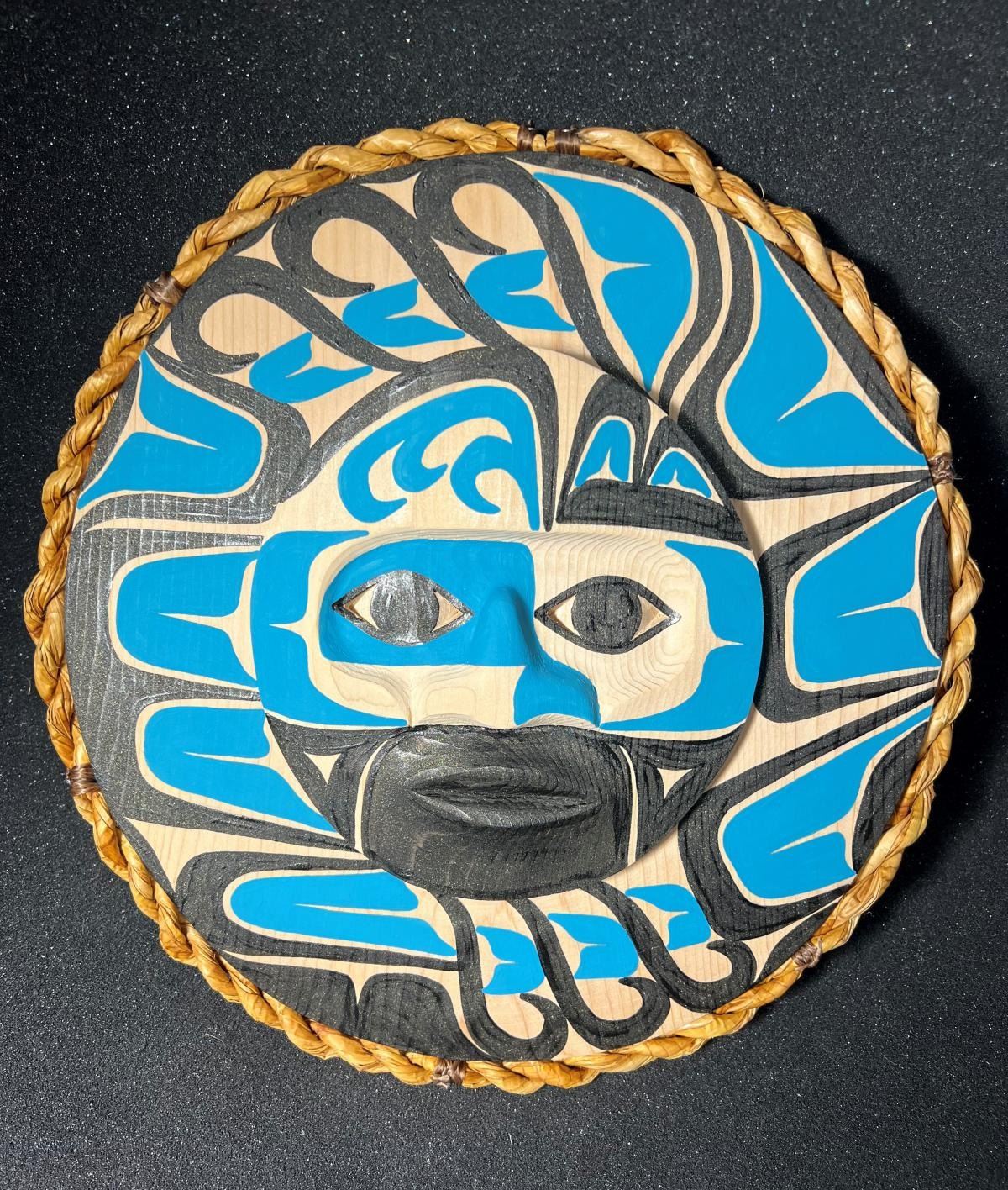 West Coast Native Moon Mask with Wind and Tide Spirit........10 inches in size.....Hand Craved on the Red cedar by First Nation Artist Russell Tate......Russell Tate is from Ditidaht First Nation on the Southwest Coast of Vancouver Island. He started carving in 2004, artists such as Art Thompson and the artists on the Ravens and Eagles show inspired him. Russell learned how to carve wood mostly working on his own. He specializes in masks and paddles, but is now working on small poles and miniatures for Regalia. Russell has worked with Ben David and Cecil Dawson, and has collaborated on several pieces with Cecil Dawson.