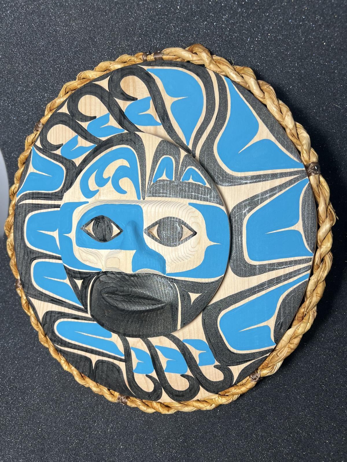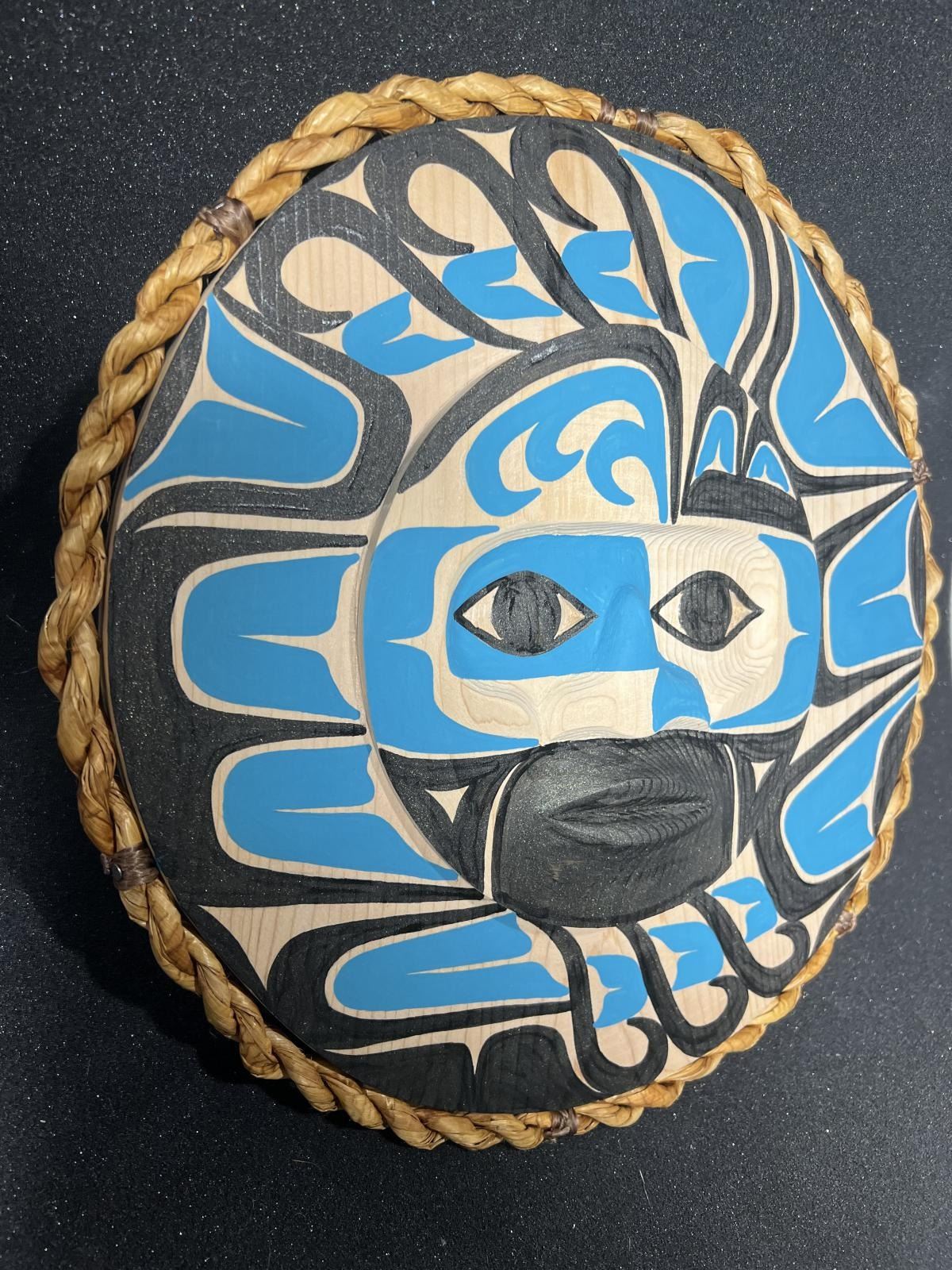 West Coast Native Moon Mask with Wind and Tide Spirit........10 inches in size.....Hand Craved on the Red cedar by First Nation Artist Russell Tate......Russell Tate is from Ditidaht First Nation on the Southwest Coast of Vancouver Island. He started carving in 2004, artists such as Art Thompson and the artists on the Ravens and Eagles show inspired him. Russell learned how to carve wood mostly working on his own. He specializes in masks and paddles, but is now working on small poles and miniatures for Regalia. Russell has worked with Ben David and Cecil Dawson, and has collaborated on several pieces with Cecil Dawson.