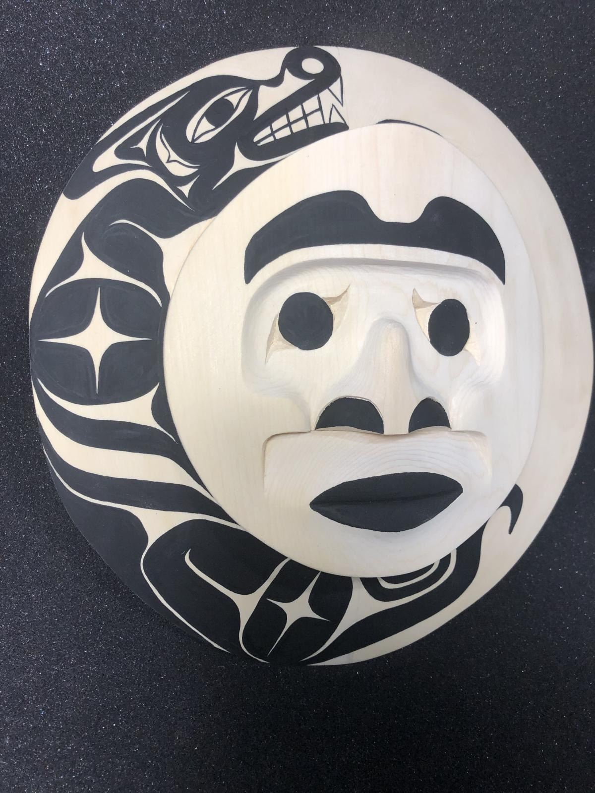 West Coast Native Moon Mask with Wolf Spirit........10 inches size.....Hand Craved on the yellow cedar by First Nation Artist Russell Tate......Russell Tate from the Ditidaht First Nation on the southwest coast of Vancouver Island. He started carving in 2004, artists such as Art Thompson and the artists on the Ravens and Eagles show inspired him. Russell learned how to wood carved mostly working on his own. He specializes in masks and paddles, but is now working on small poles and miniatures for regalia. Russell has worked with Ben David and Cecil Dawson, and has collaborated on several pieces with Cecil