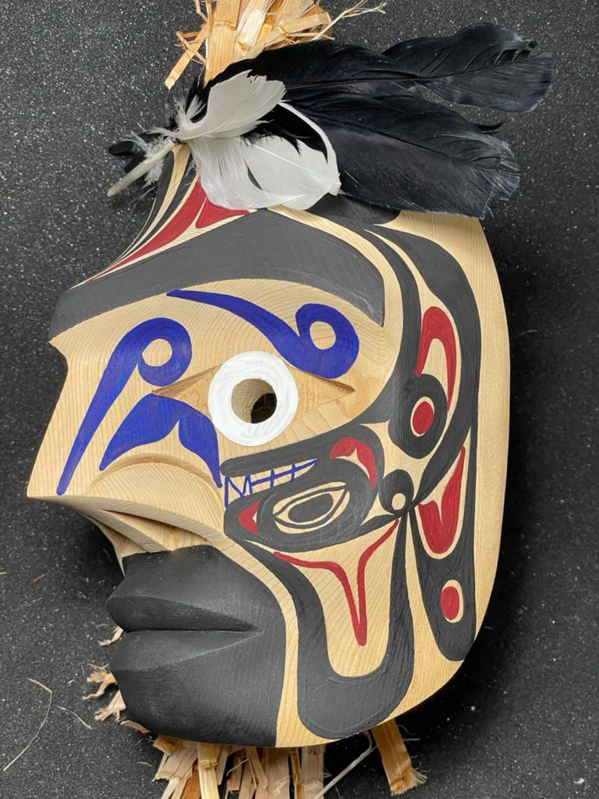West Coast Native Hand Carved Warrior Mask with Killer Whale Spirit........8 inches plus the accessories height....cedar baek hairs .....Hand Craved on the Red cedar by First Nation Artist Russell Tate......Russell Tate from the Ditidaht First Nation on the southwest coast of Vancouver Island. He started carving in 2004, artists such as Art Thompson and the artists on the Ravens and Eagles show inspired him. Russell learned how to wood carved mostly working on his own. He specializes in masks and paddles, but is now working on small poles and miniatures for regalia. Russell has worked with Ben David and Cecil Dawson, and has collaborated on several pieces with Cecil