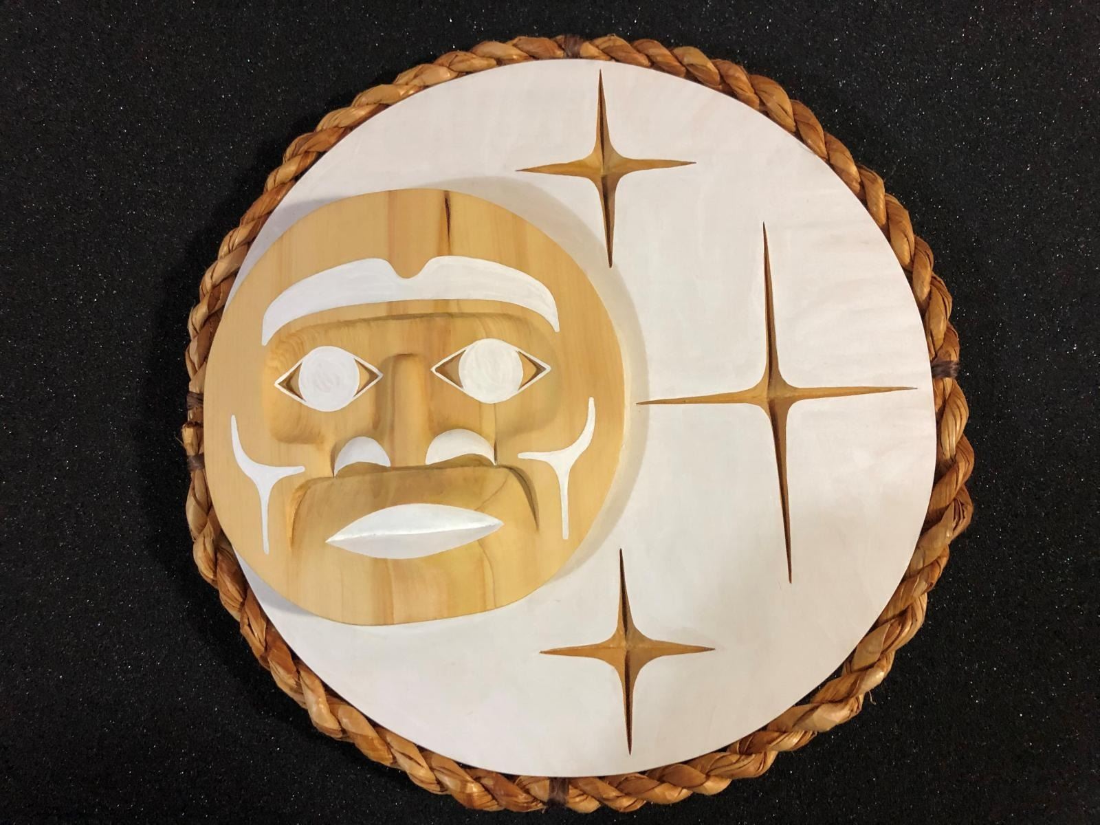 West Coast Native Winter Moon Mask ........12 inches size.....Hand Craved on the yellow cedar by First Nation Artist Russell Tate......Russell Tate from the Ditidaht First Nation on the southwest coast of Vancouver Island. He started carving in 2004, artists such as Art Thompson and the artists on the Ravens and Eagles show inspired him. Russell learned how to wood carved mostly working on his own. He specializes in masks and paddles, but is now working on small poles and miniatures for regalia. Russell has worked with Ben David and Cecil Dawson, and has collaborated on several pieces with Cecil