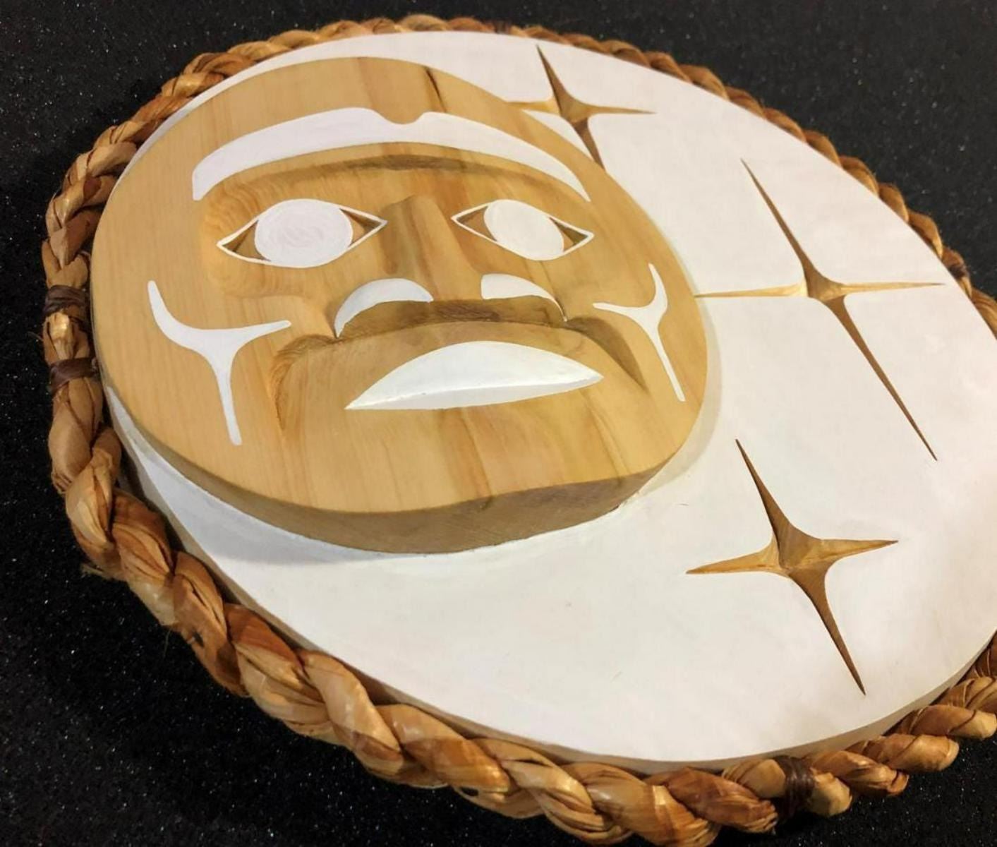 West Coast Native Winter Moon Mask ........12 inches size.....Hand Craved on the yellow cedar by First Nation Artist Russell Tate......Russell Tate from the Ditidaht First Nation on the southwest coast of Vancouver Island. He started carving in 2004, artists such as Art Thompson and the artists on the Ravens and Eagles show inspired him. Russell learned how to wood carved mostly working on his own. He specializes in masks and paddles, but is now working on small poles and miniatures for regalia. Russell has worked with Ben David and Cecil Dawson, and has collaborated on several pieces with Cecil