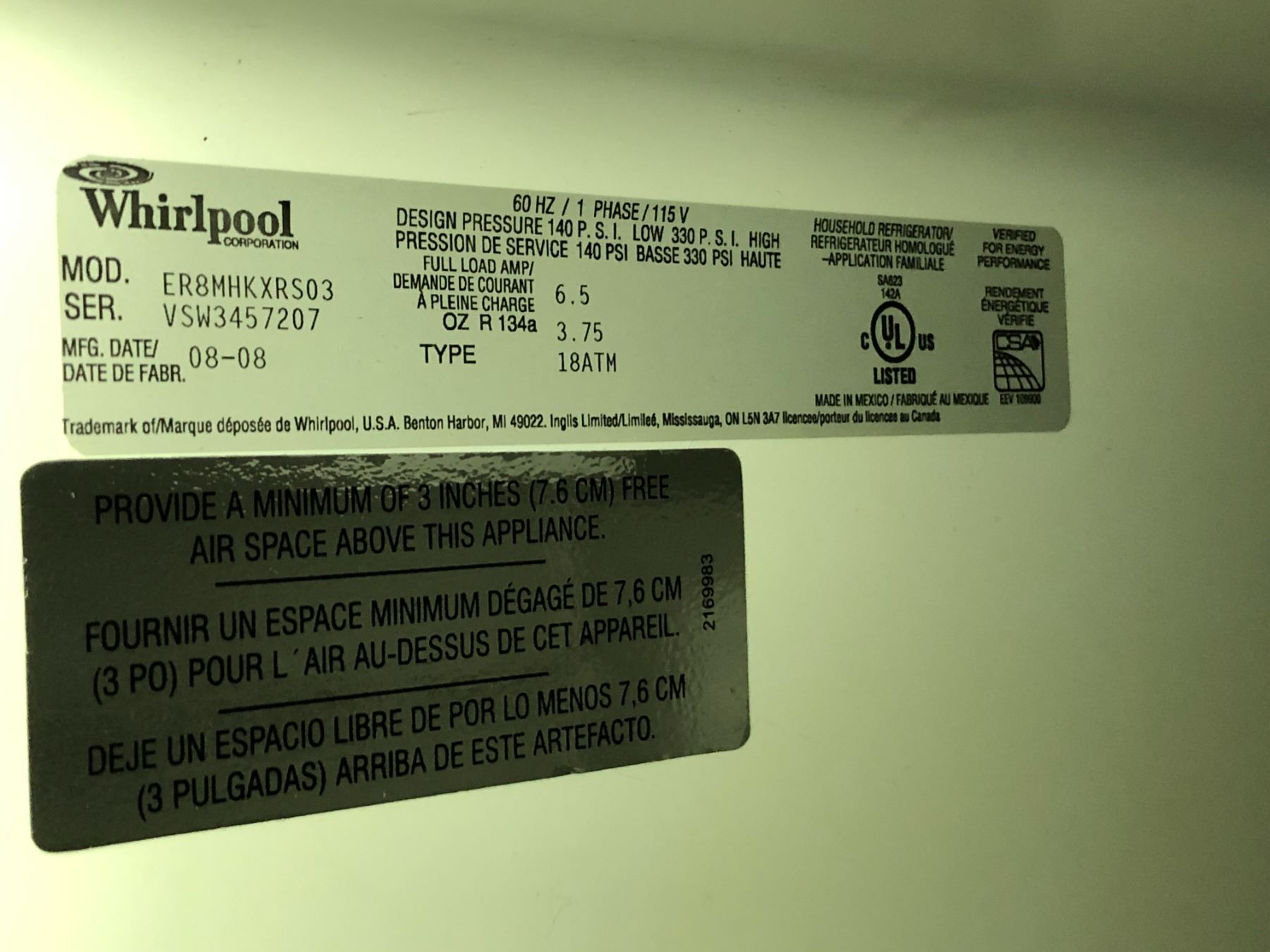 Whirlpool fridge model: ER8MHKXRS03