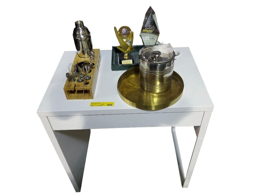 White IKEA Micke Desk, Bar Tools & 2 Trophies