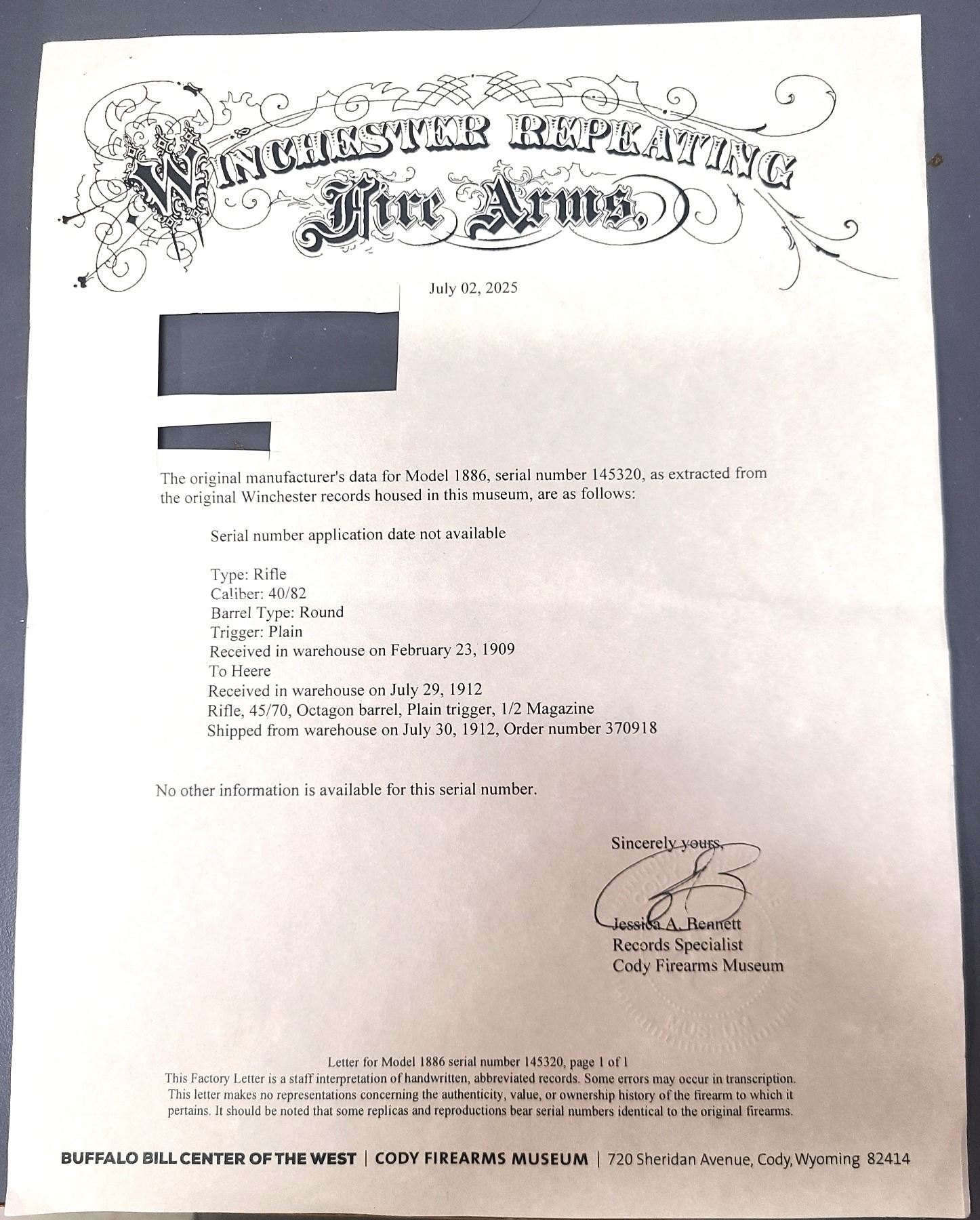 Model 1886 Serial Number 145320 was originally made in a 40-82 Caliber on Feb