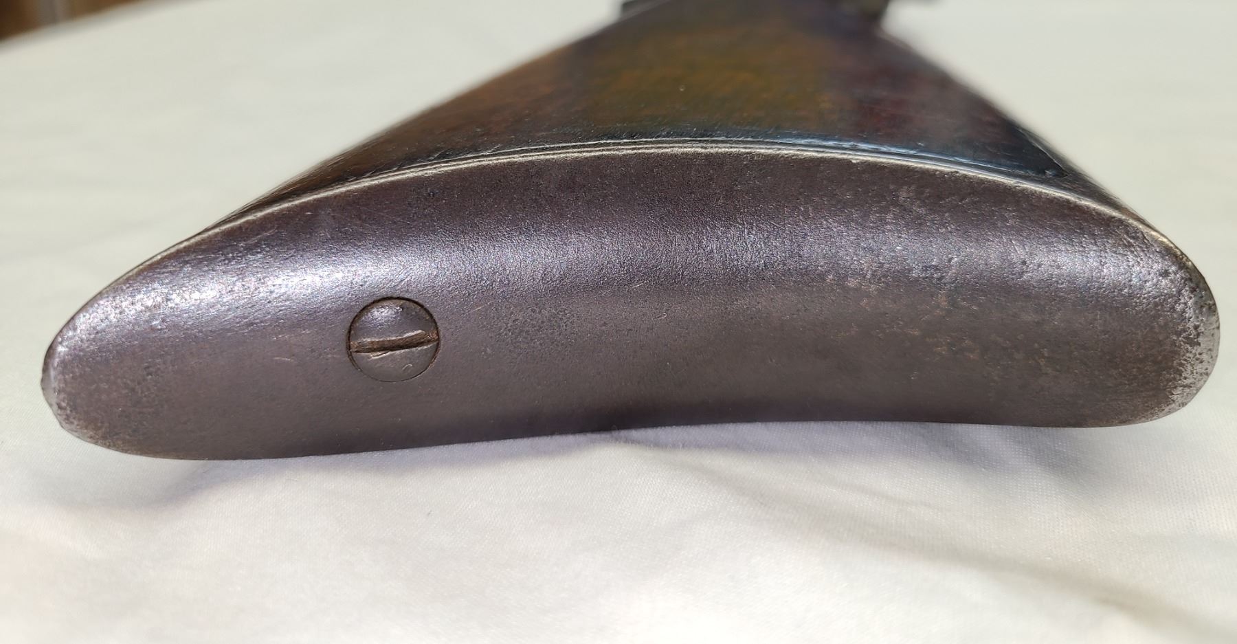 Has cresent steel butt plate. Barrel retains 45% original blue turned patina with