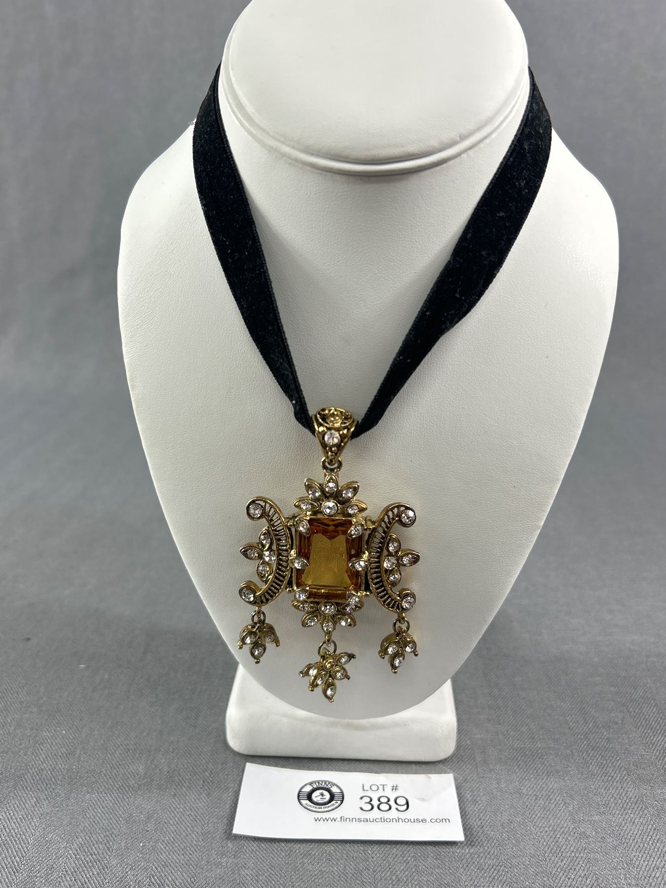 Wonderful Topaz Glass Stone Center w/ Rhinestones Pendant + Black Velvet Chain Necklace