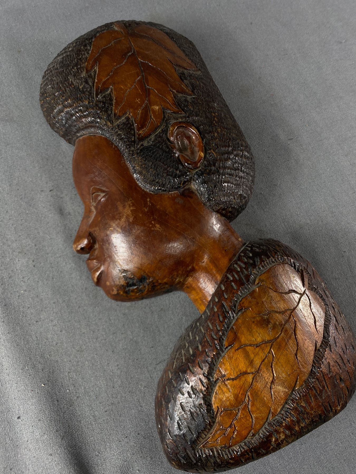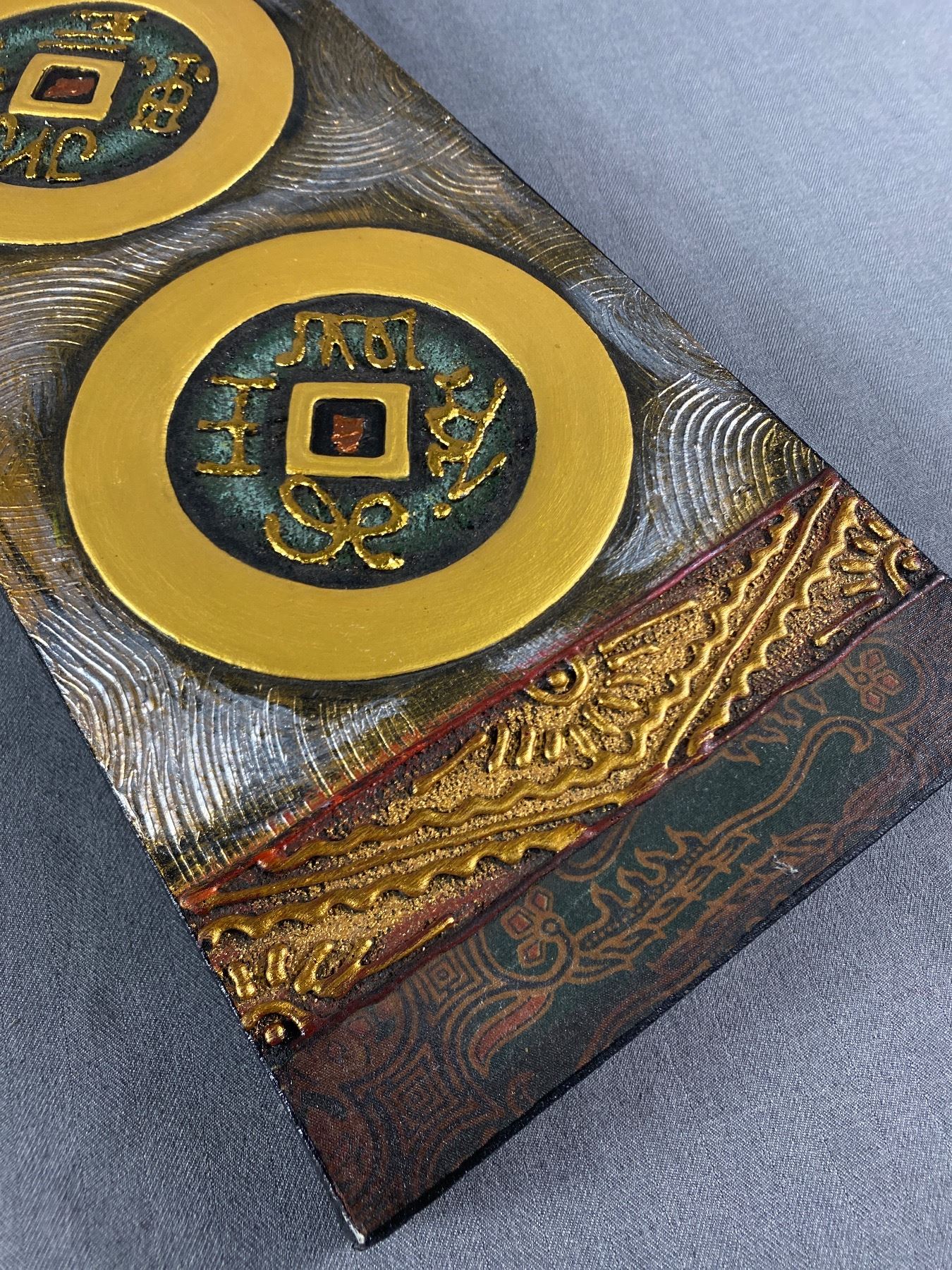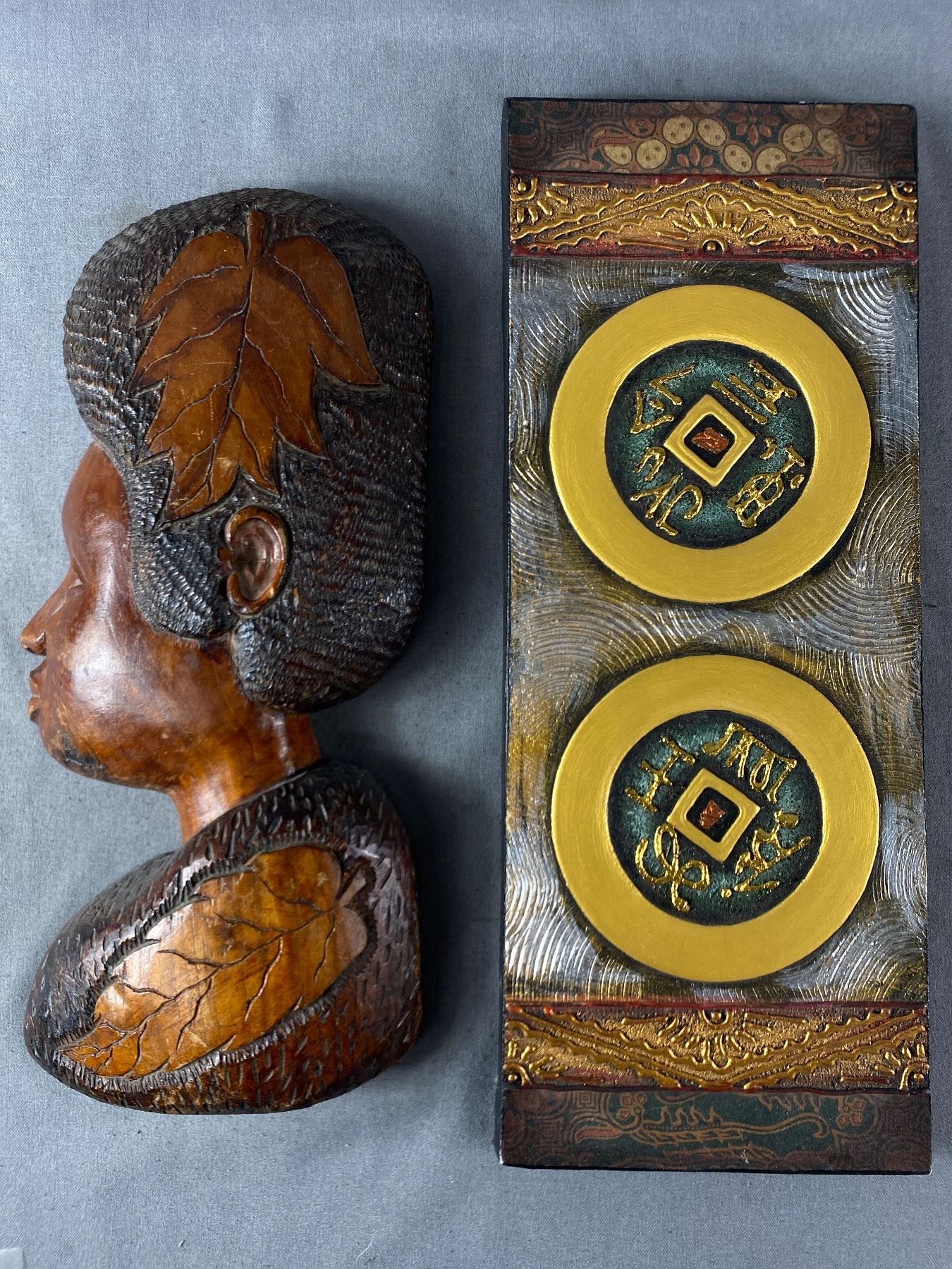 Wood Carved Side Portrait Approx. 17 1/2" H & Bali Coin Art Piece On Canvas. Approx. 8" x 20"