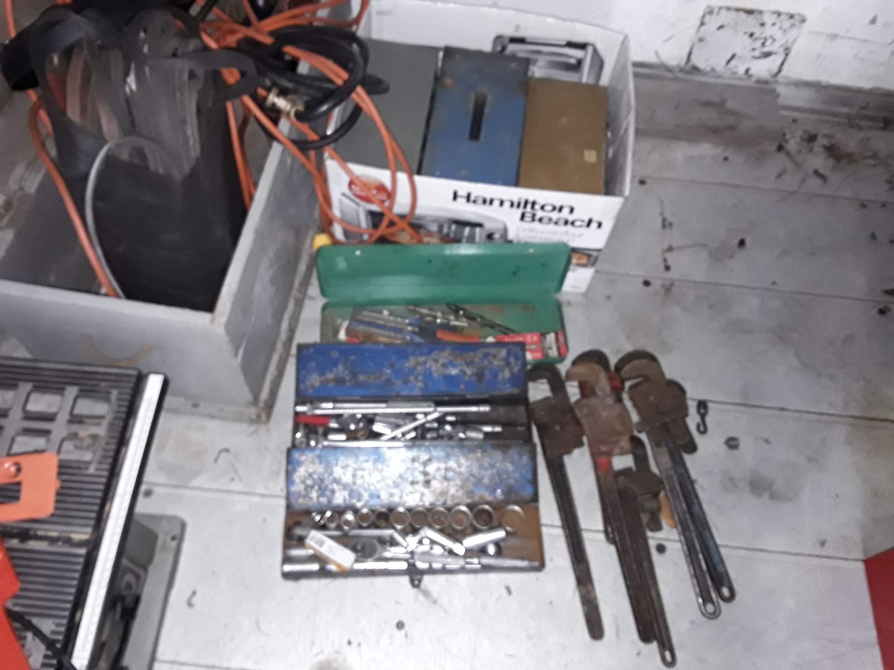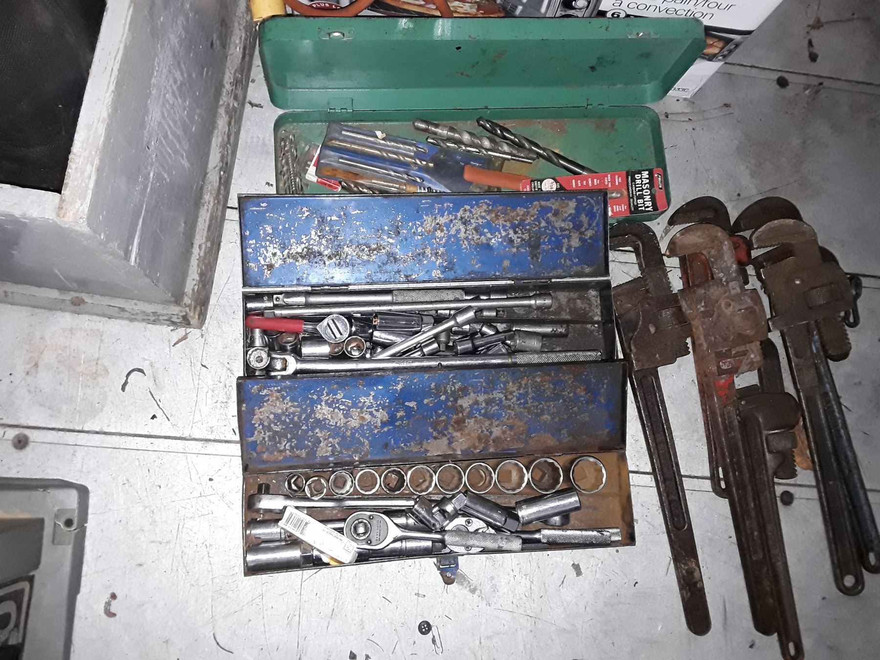 Wood Chest W/Contents + Box W/6 Pipe Wrenches, Sockets + Much More, - 17% Buyer Fee. Payment Processed through Live Auction World ( Visa or Master Card ) pick up Saturday, or Tuesday