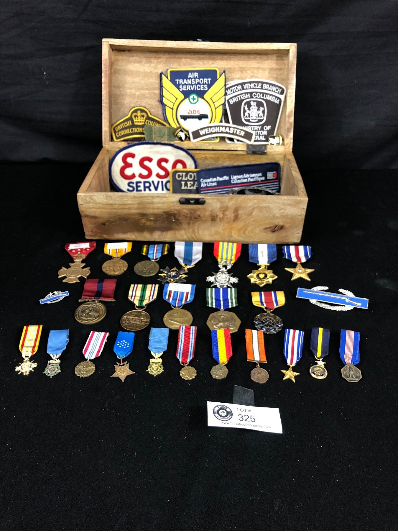 Wooden Box Full of Military Medals and Patches, Mostly American, some Canadian