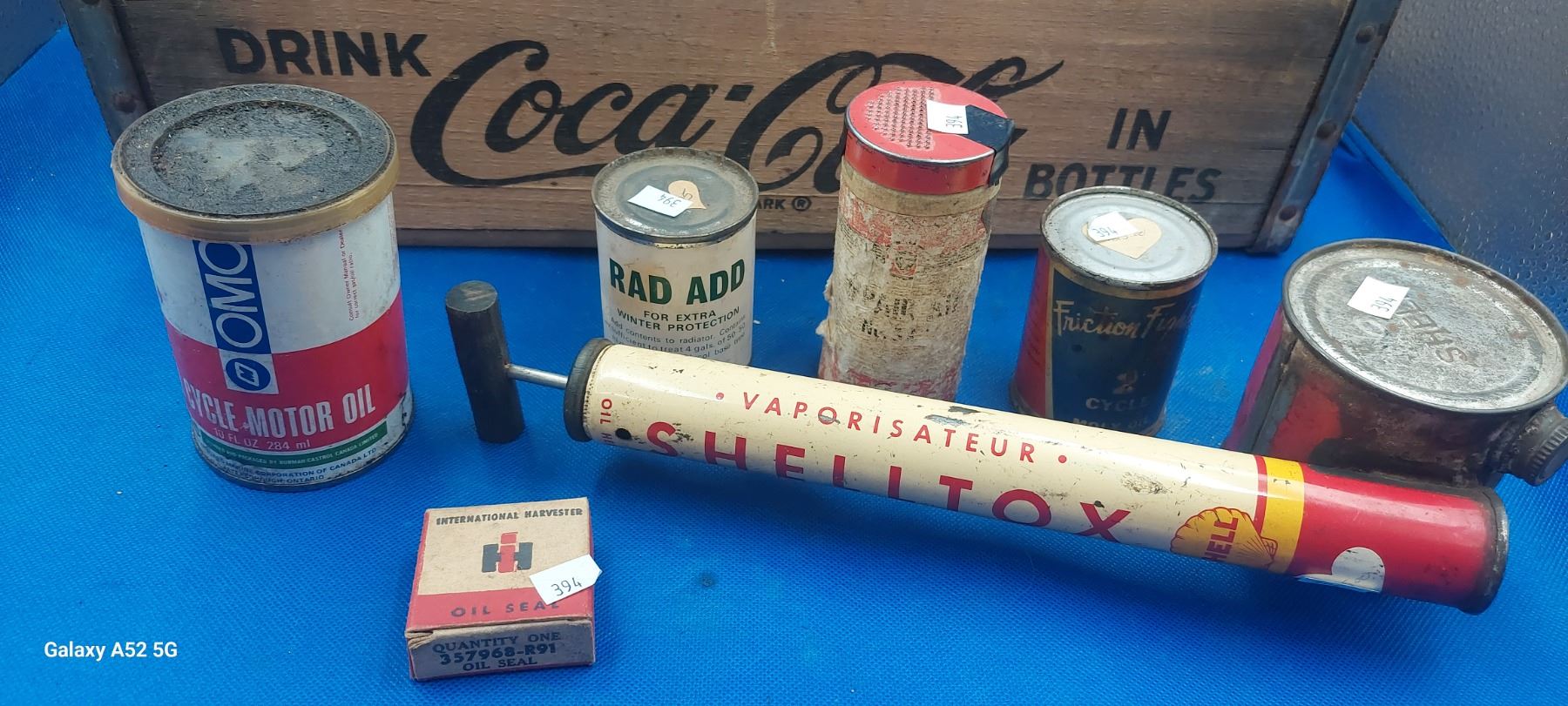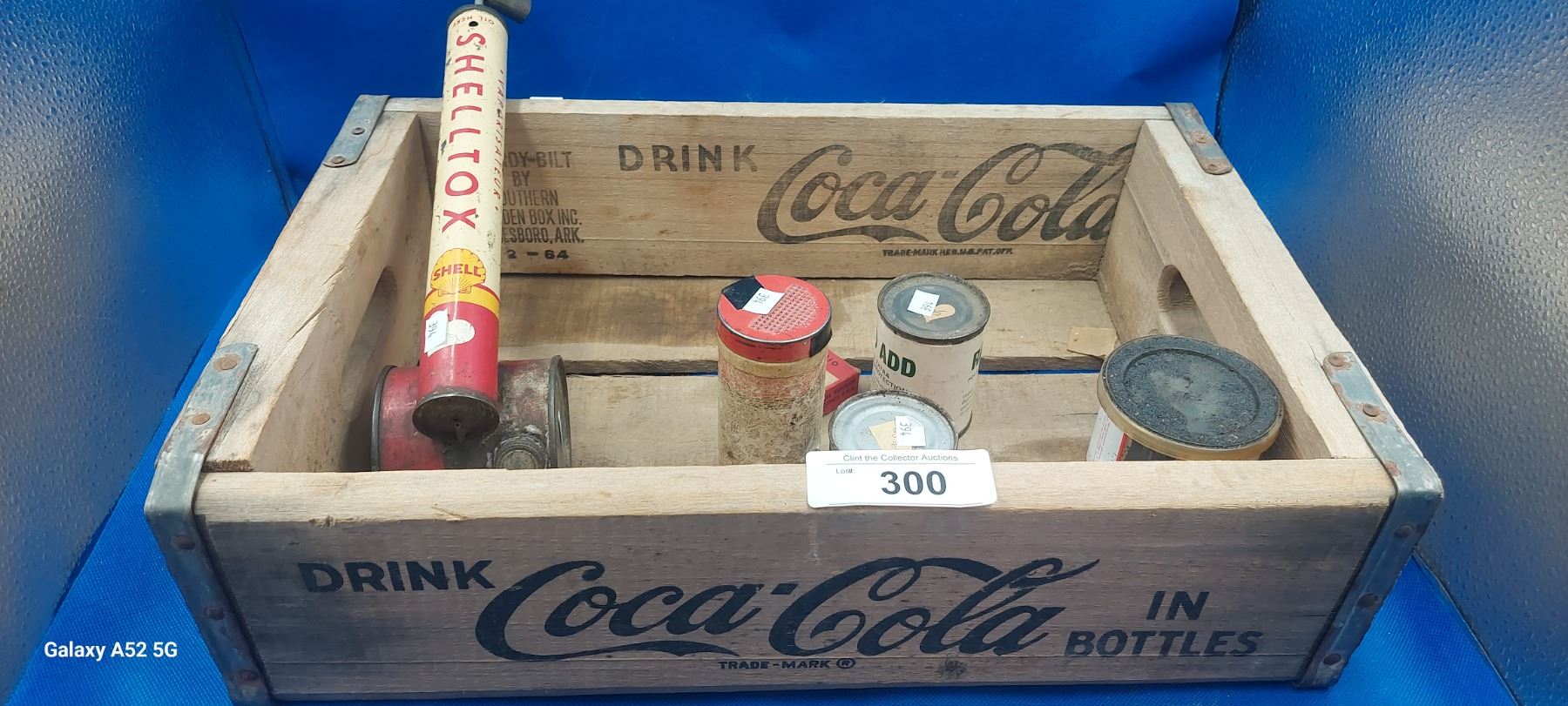 Wooden Coke crate inc misc tins and Shell spray gun
