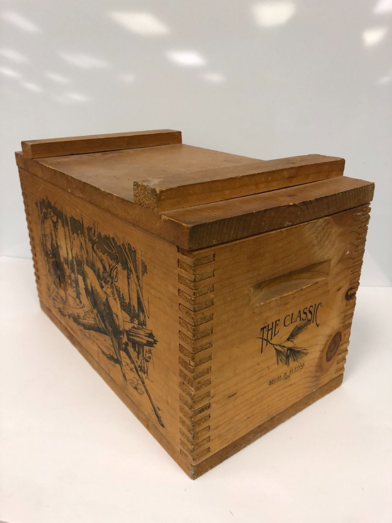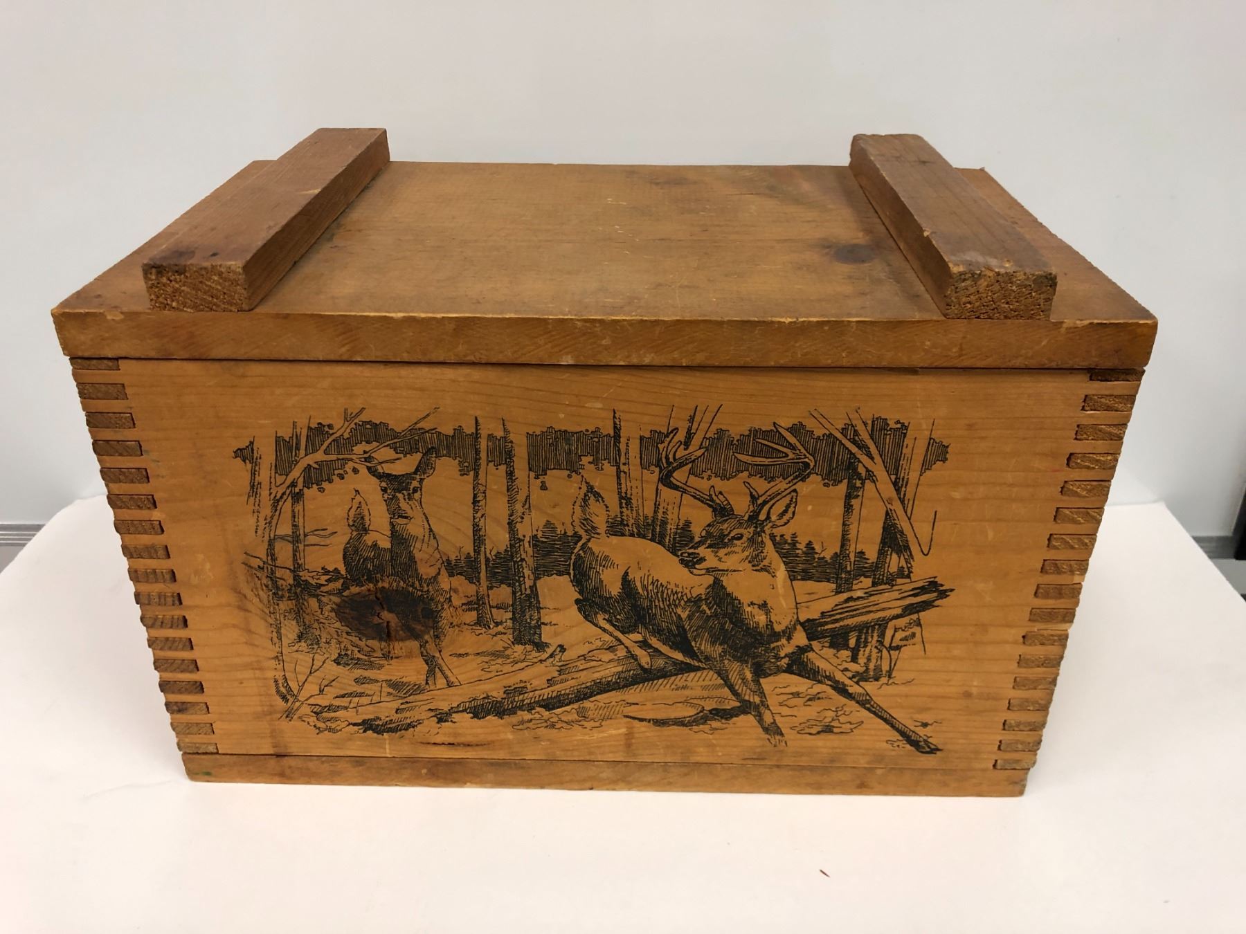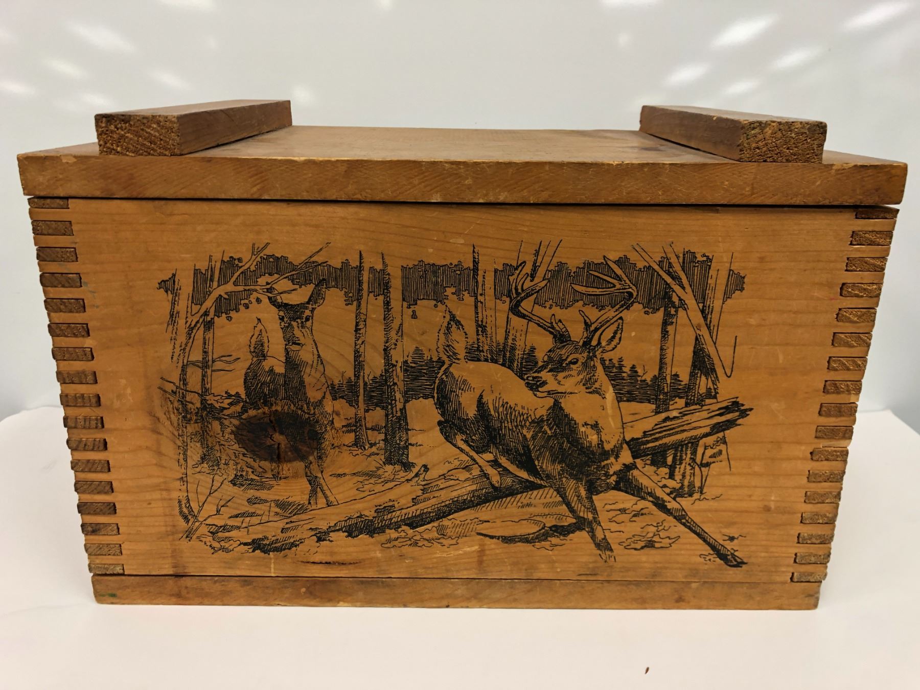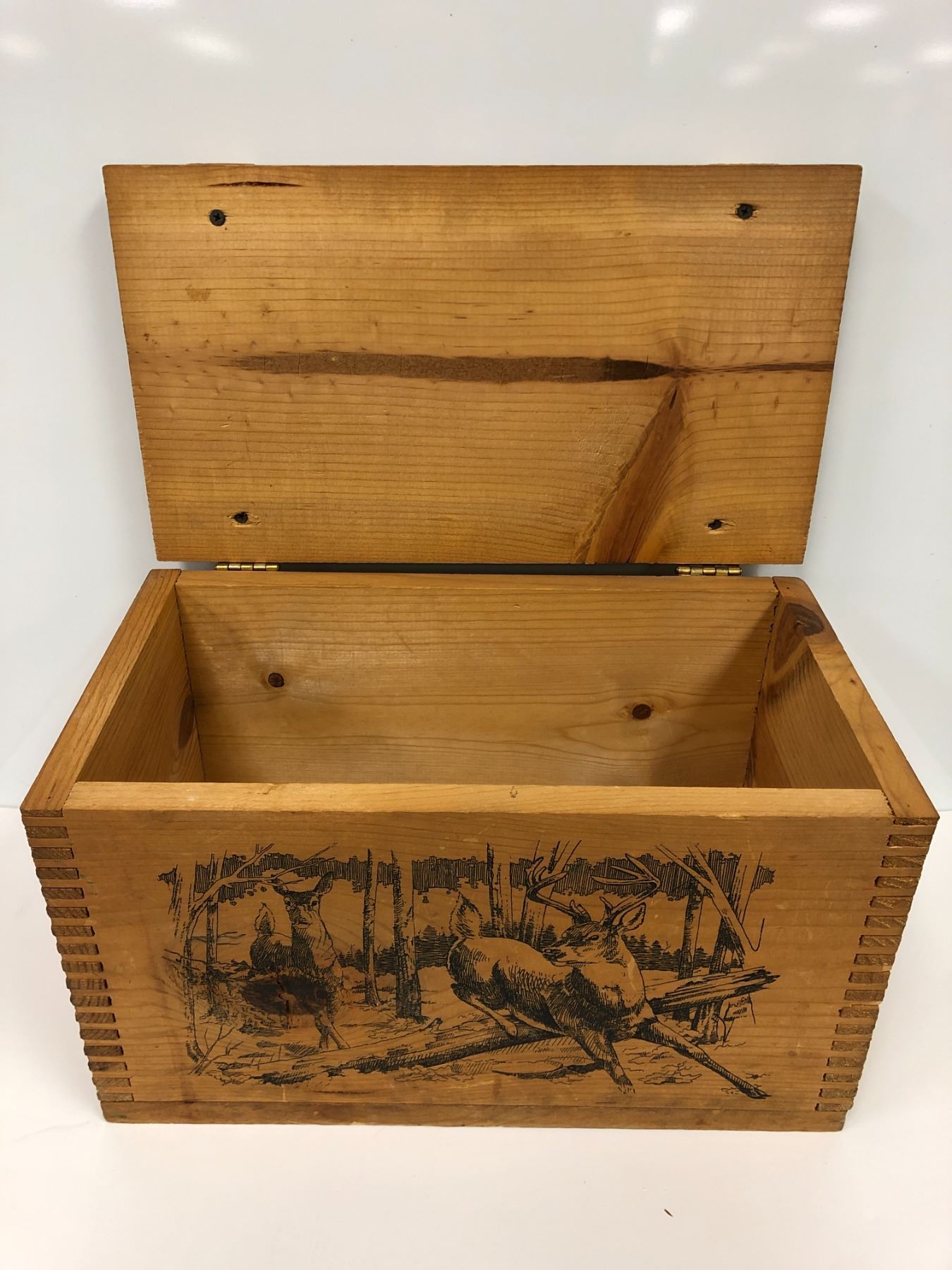 Wooden dovetailed lidded pine box with stag motif from movie set - 16in x 9in x 9 3/4in