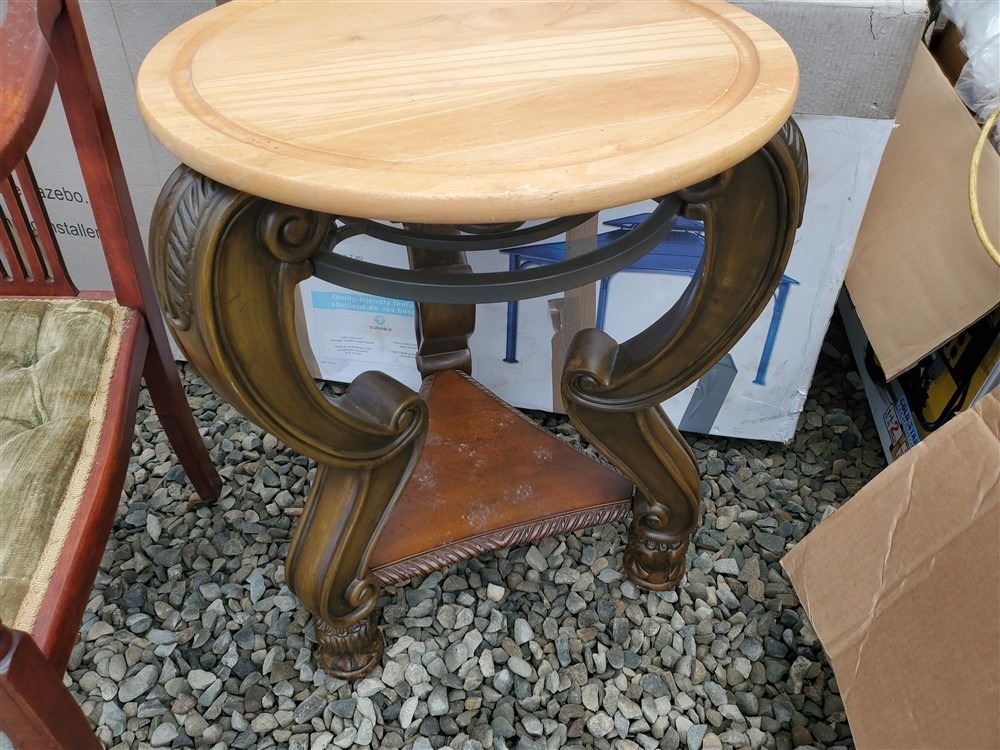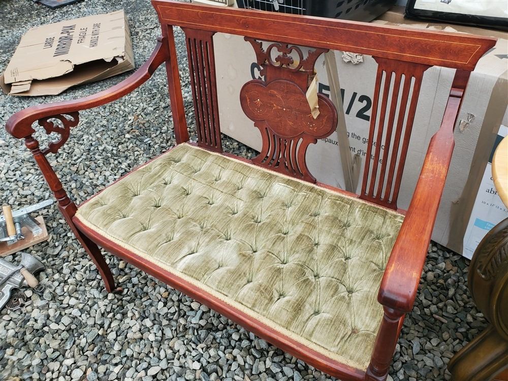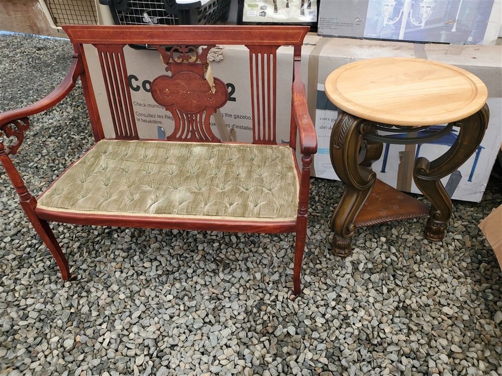 Wooden love seat & Round end table - Most Items have not been tested - 17% Buyer Fee. Payment Processed through Live Auction World ( Visa or Master Card ) pick up Saturday, or Tuesday