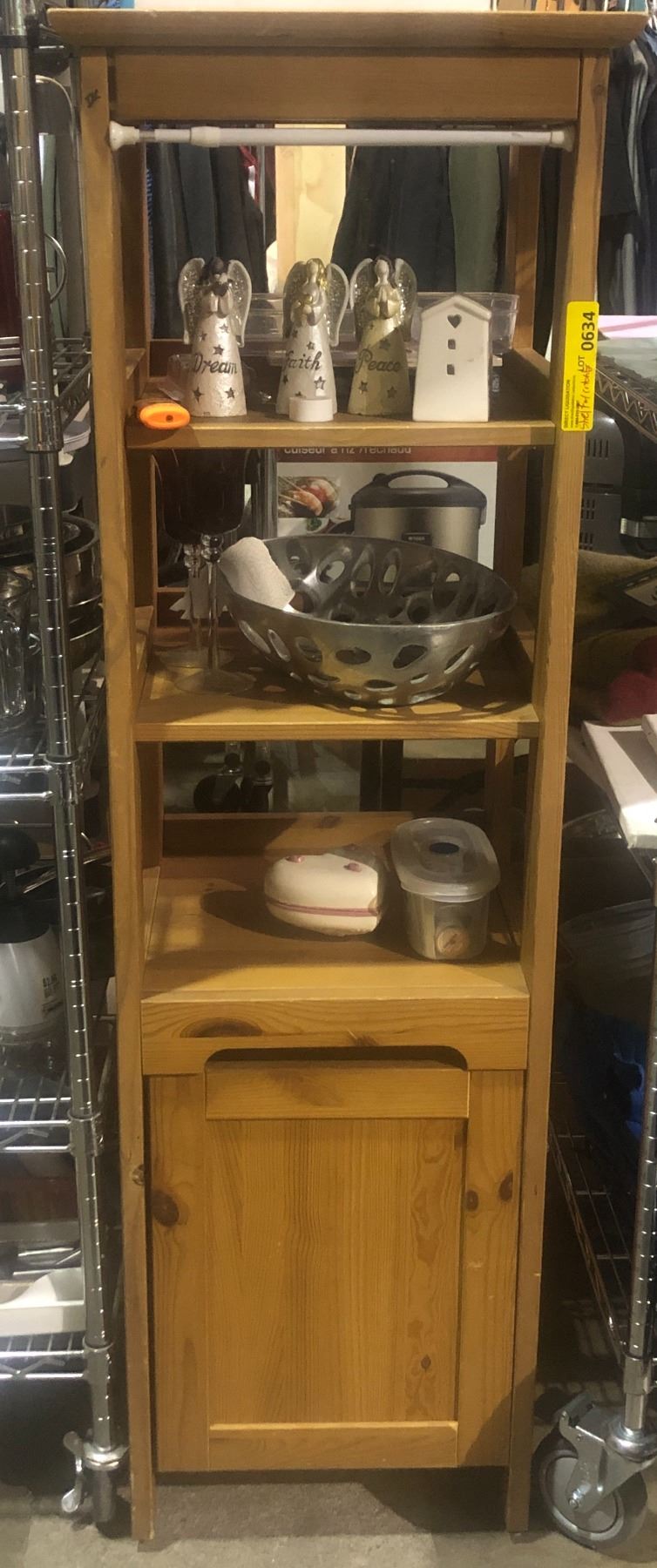 Wooden shelf w/assorted decorative contents (approx. 57in H x 18in W 18in D)