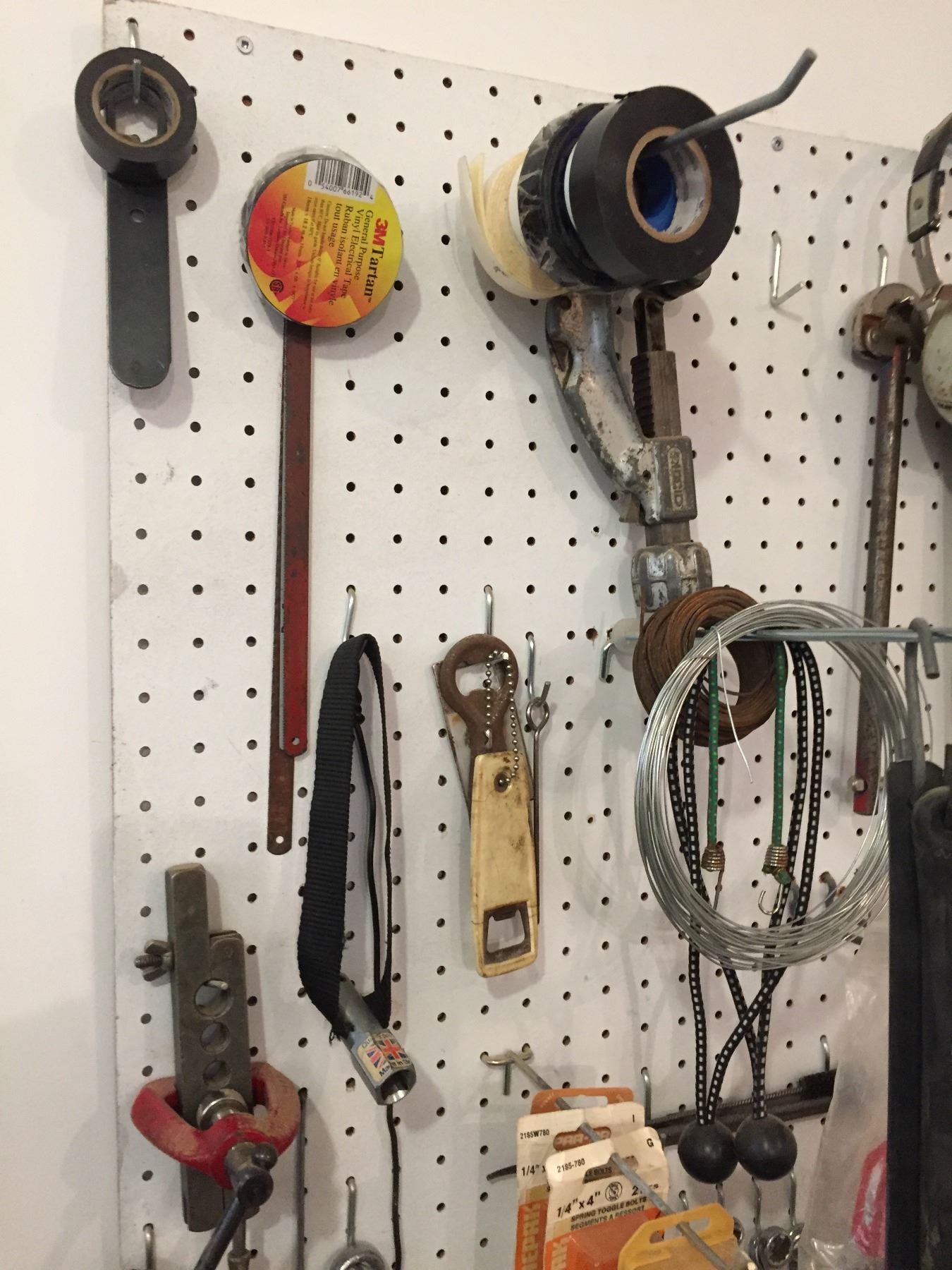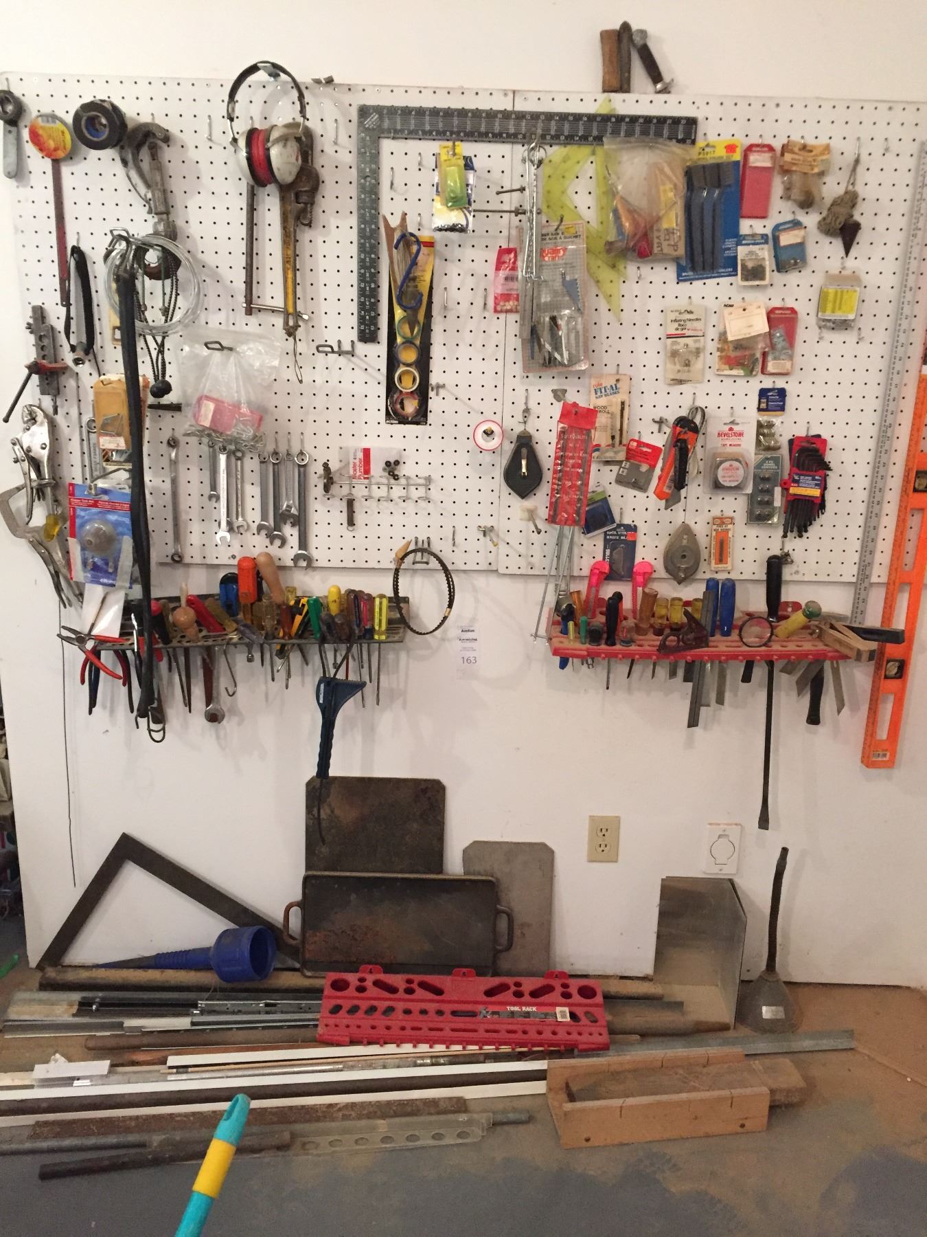 Contents on wall and ground below includes, squares, levels, wrenches, clamps, metal items on floor and more. Bring packing materials. Come to pick up Category A time slot (9:00 am - 10:00 am)