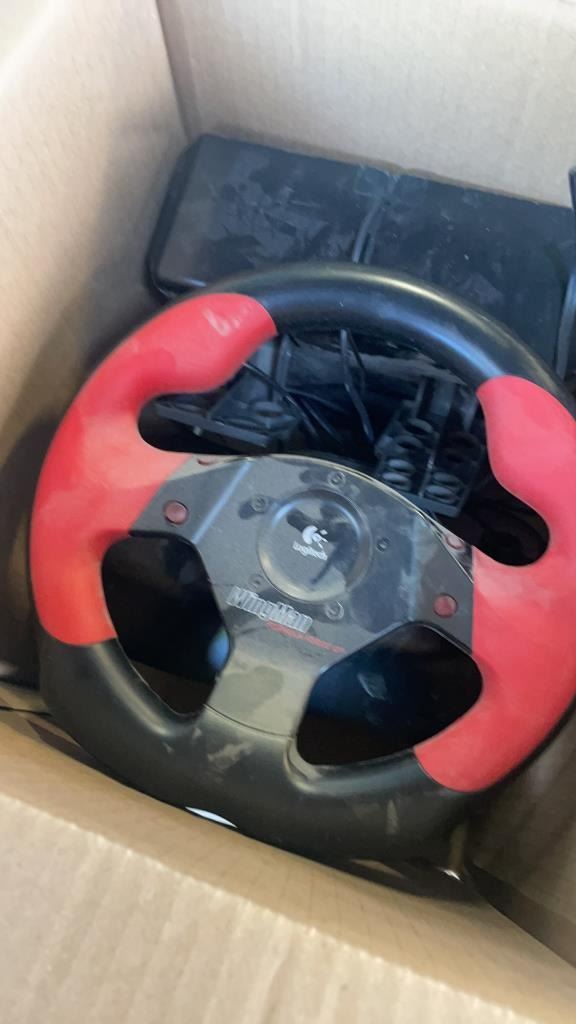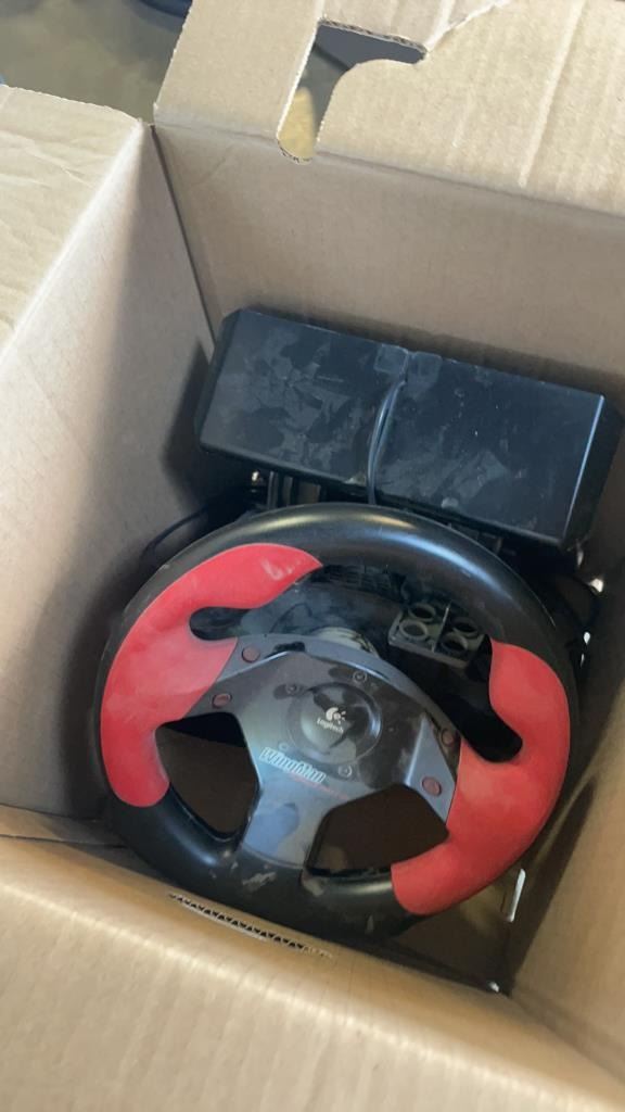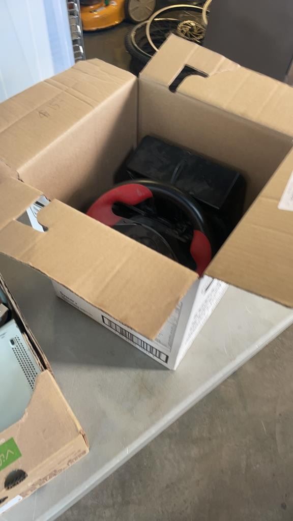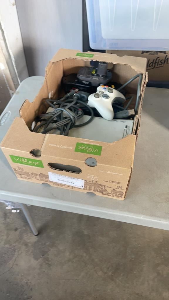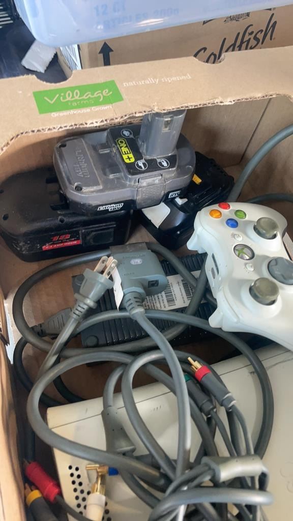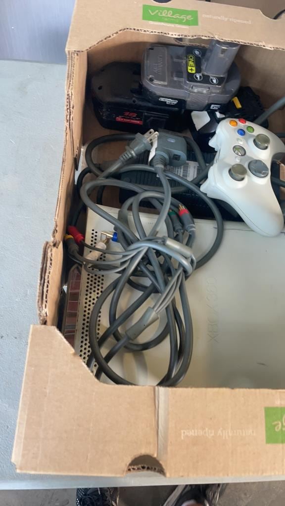 XBOX 360 CONSOLE WITH CONTROLLER, CORDS AND 3 CORDLESS POWER TOOL BATTERIES WITH RACING WHEEL