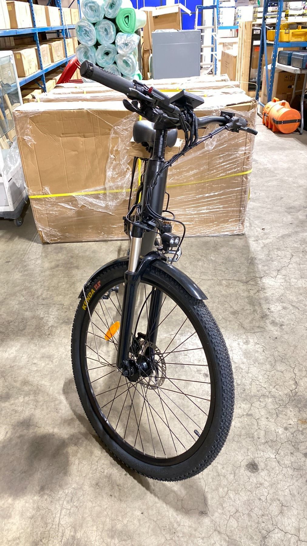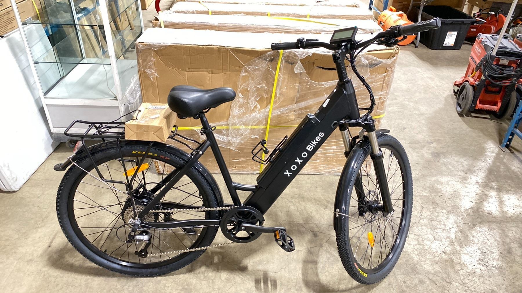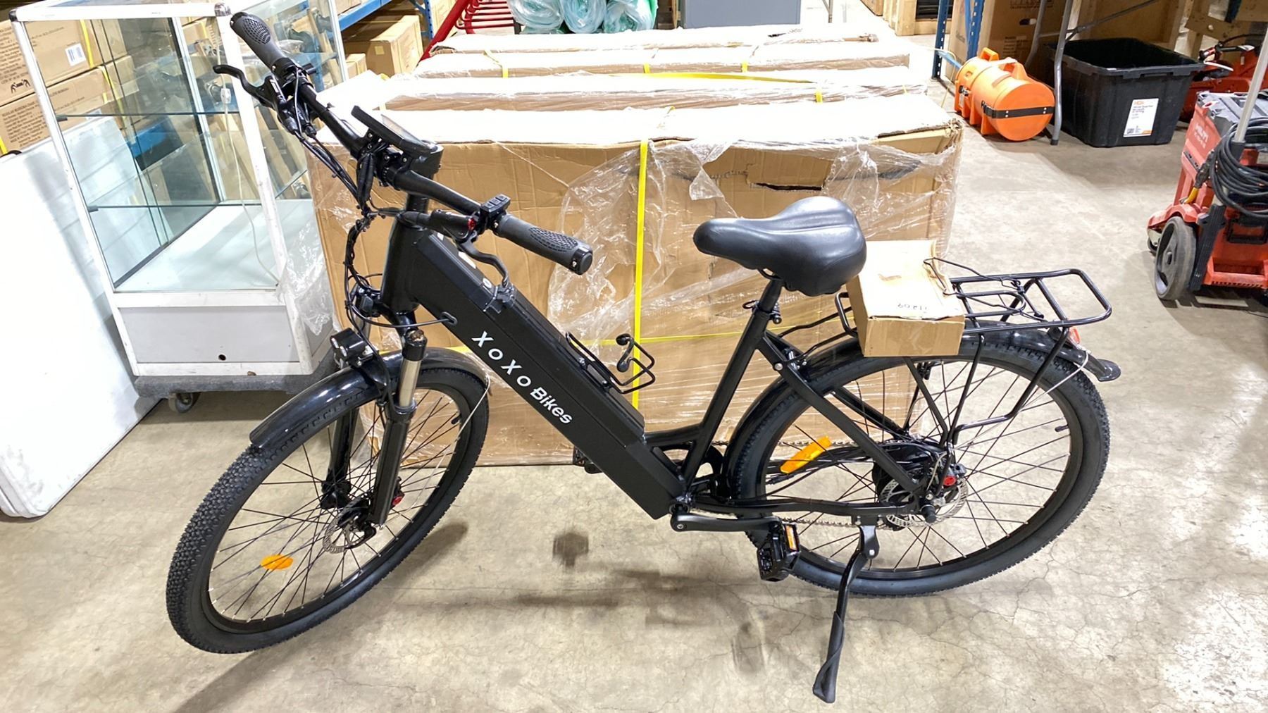 XOXO BIKES BLACK MOUNTAIN ELECTRIC BIKE MODEL NUMBER HOTEBIKE A6AH27.5 *NEW IN BOX* 30KM/H TOP SPEED, 60-80 KM RANGE, KEY FEATURES TRIANGLE FRAMED BIKES, 500W 48V BRUSHLESS MOTOR, 48V10AH LITHIUM BATTERY, SHIMANO ALTUS 9-SPEED + KAFFEE FREEWHEEL, LCD 3-ROW DISPLAY WITH 5 SPEED LEVELS, 160MM HYDRAULIC DISC BRAKES, CONJOINED SHIFTER WITH POWER CUT-OFF BRAKING, 6061 FULLY ALUMINUM FRAME, 27.5 X 1.95 DUAL-WALL REINFORCED TIRES, ADJUSTABLE ALUMINUM ALLOY SUSPENSION FORK, QUICK- RELEASE WATERPROOF CABLES, INTEGRATED FRONT & REAR LIGHTS WITH BRAKE LIGHT, BUILT-IN USB CHARGER, KICKSTAND INCLUDED