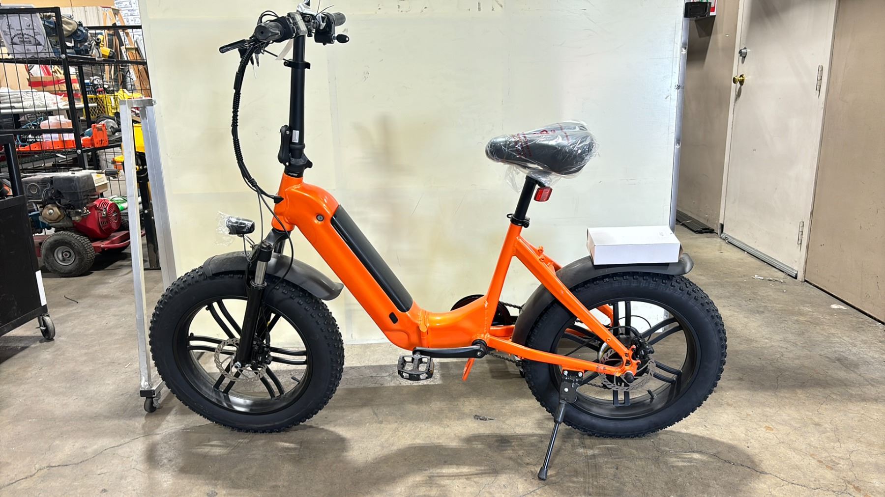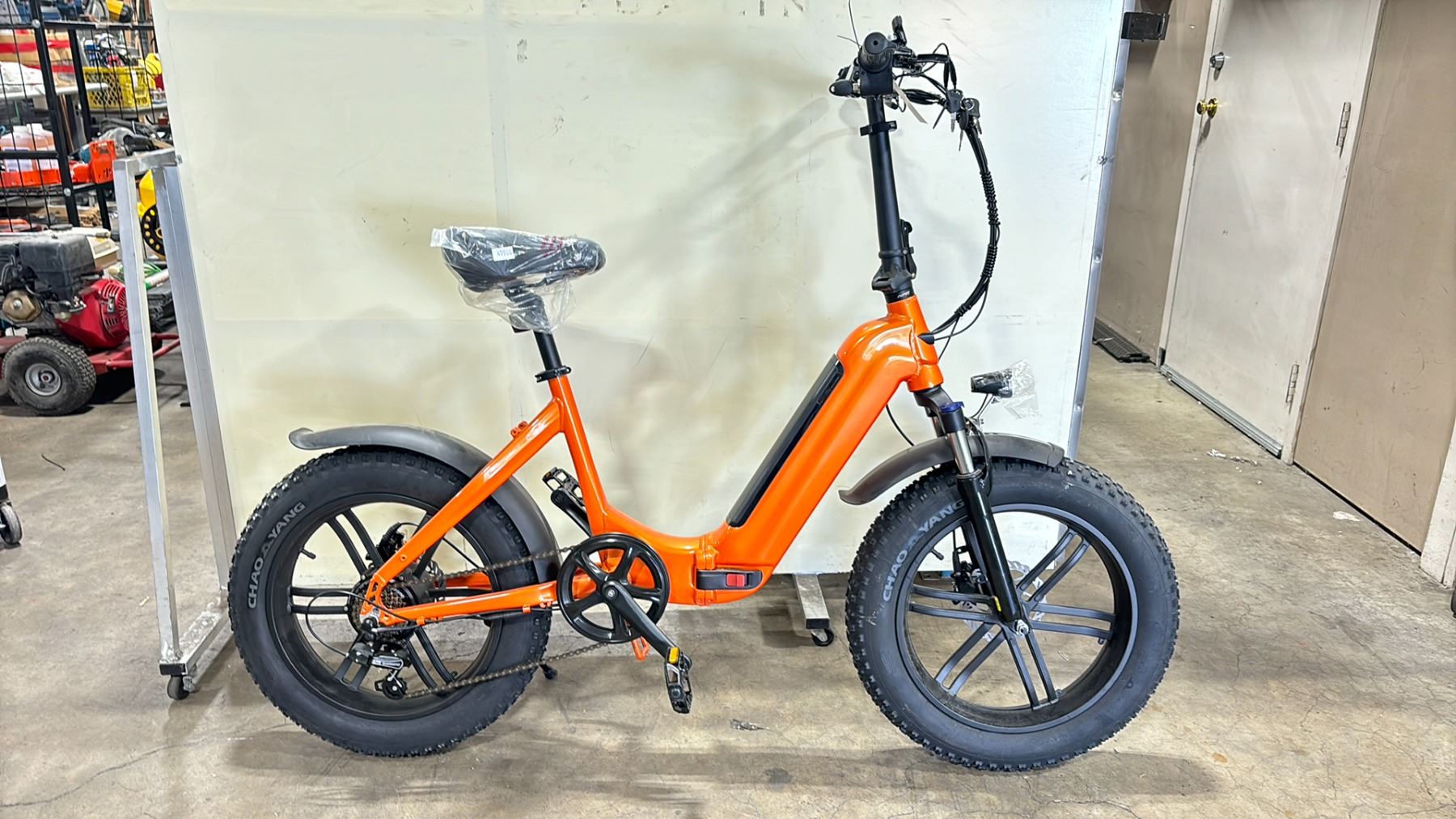 Y20 ORANGE ELECTRIC FOLDABLE E-BIKE WITH CHARGER - 75 KM RANGE, HYDRAULIC DISC BRAKES, 7 LEVELS, LCD DISPLAY, HEADLIGHT, MOTOR: 500W / 1000W MOTOR, 35 KMH MAX SPEED BATTERY: 48V TIRES: 4" X 20" FAT TIRE - INCLUDES KEYS & CHARGER **DISPLAY MODEL**