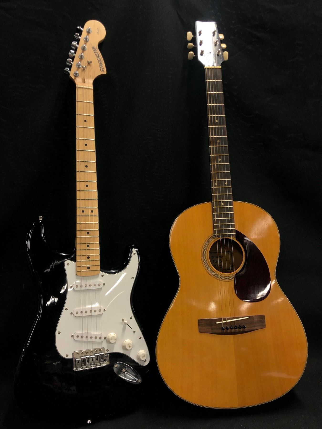 YAMAHA FG-75 ACOUSTIC GUITAR AND FENDER STARCASTER ELECTRIC GUITAR, NOT TESTED