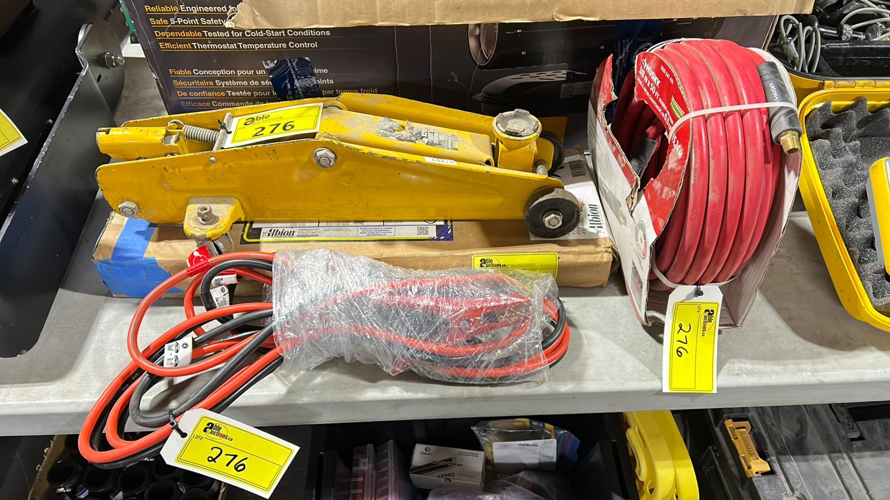 YELLOW 2 TON MOBILE JACK, ALBION CAULKING GUN, ROLL OF HUSKY 3/8" 50' AIR HOSE & PAIR OF JUMPER CABLES