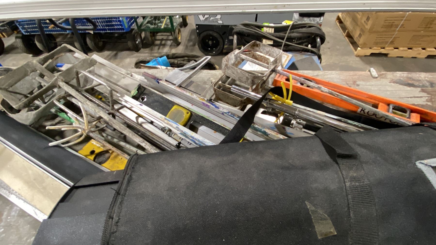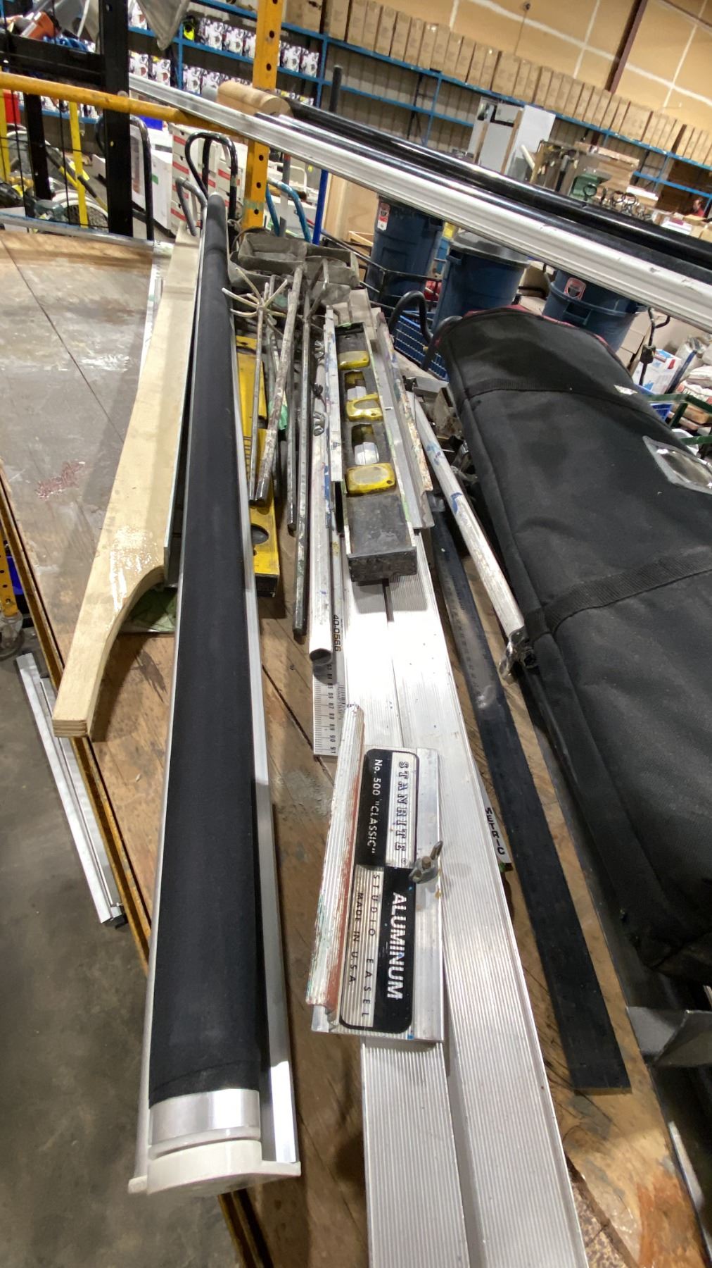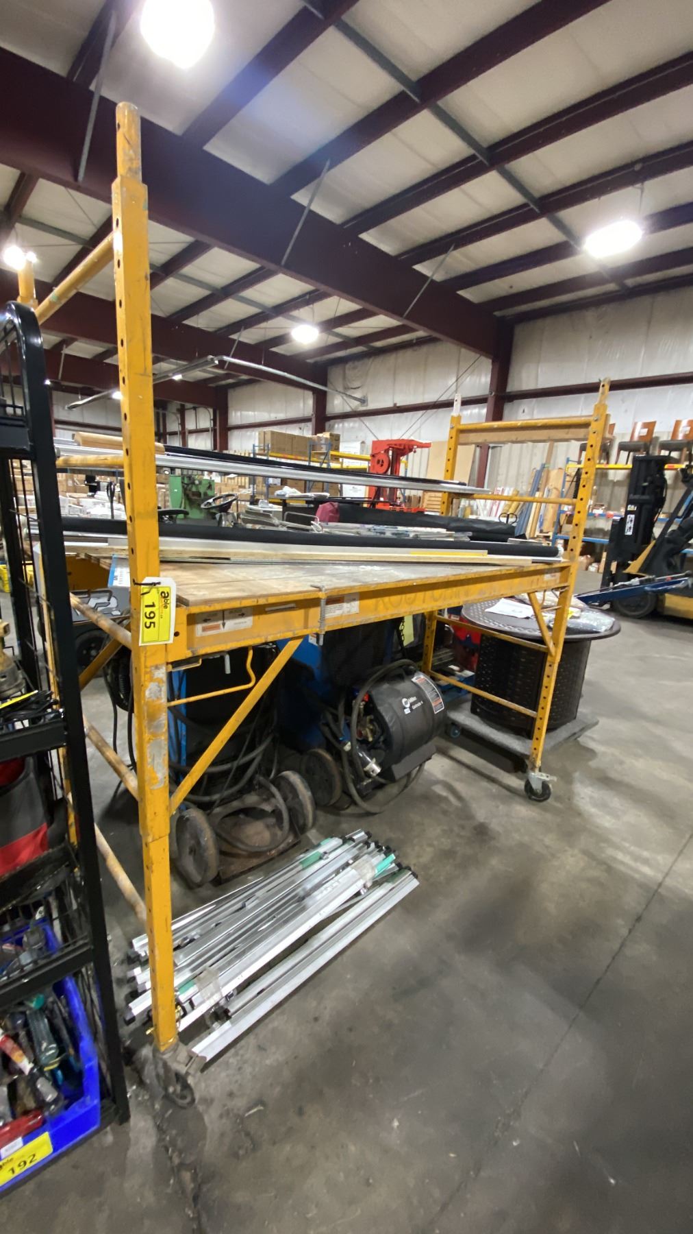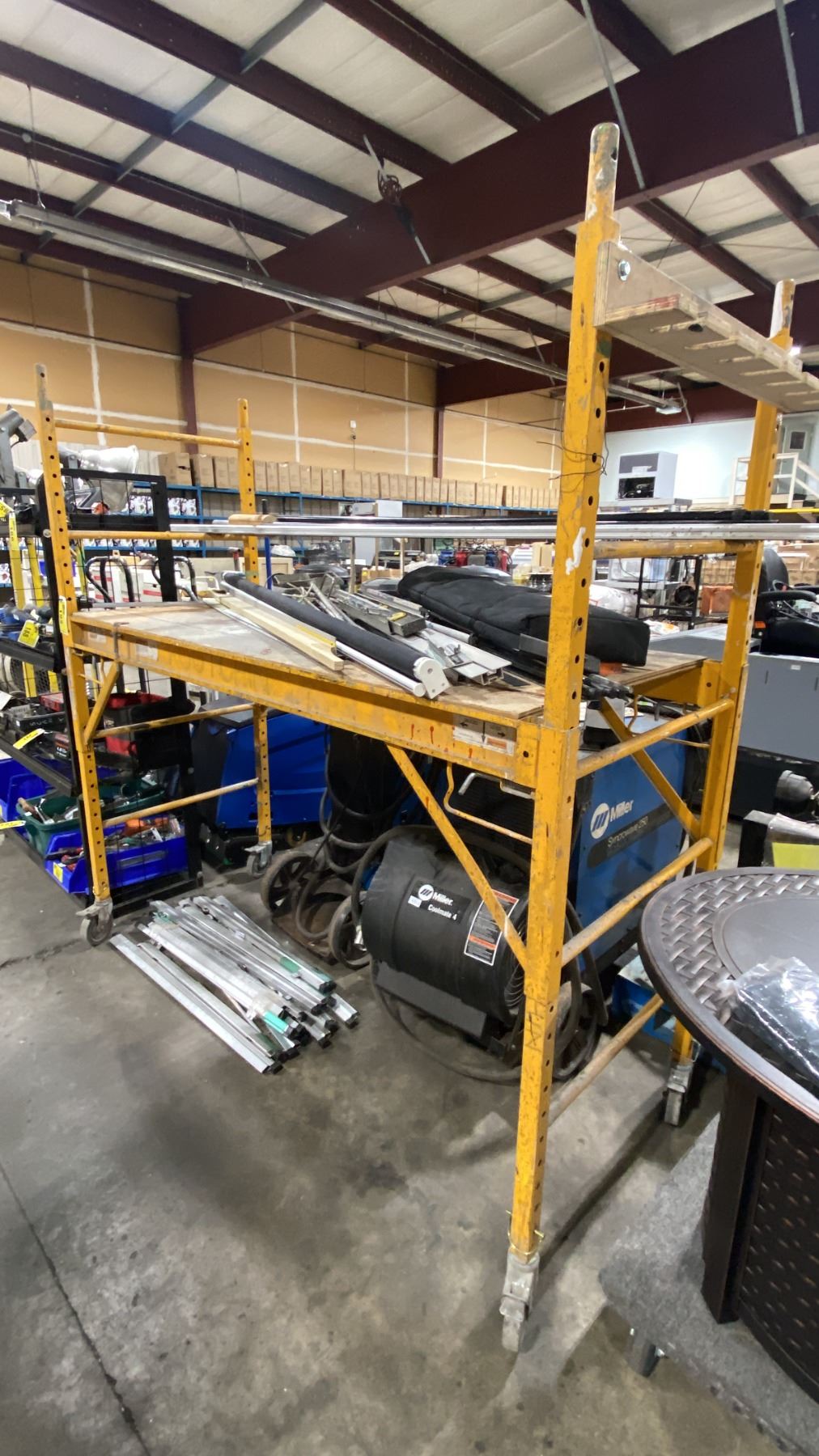 YELLOW ADJUSTABLE PAINTERS SCAFFOLDING WITH DRYING RACKS, MIXING PADDLES, STRAIGHT EDGES, SIGNS & ASSORTED PRINT SHOP TOOLS