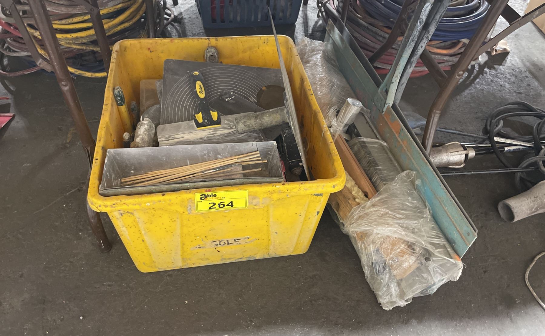 YELLOW BIN OF INDUSTRIAL DRYWALL MUDDING TOOLS & CEMENT TOOLS *BIN INCLUDED*