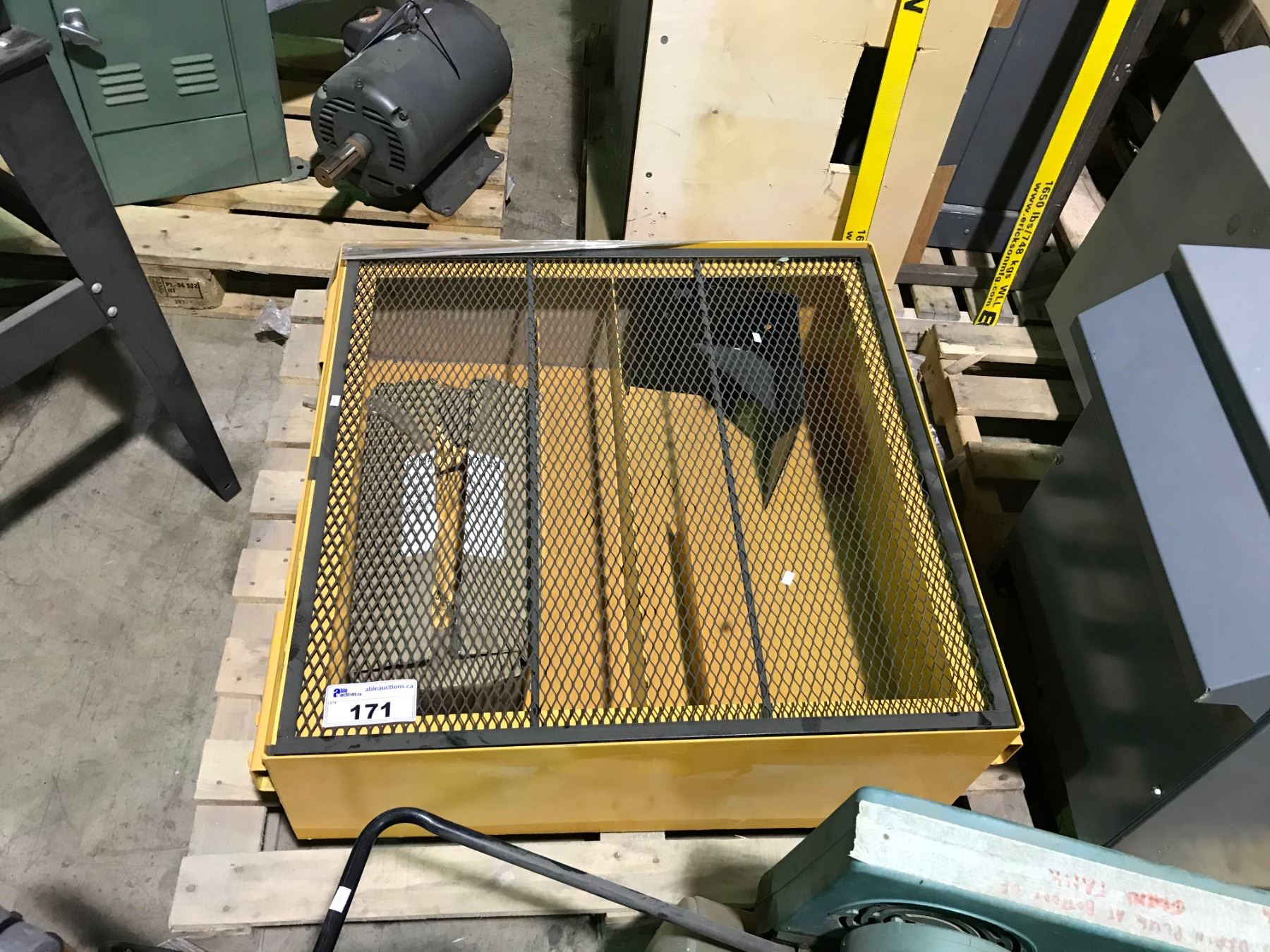 YELLOW METAL CAGE STORAGE CONTAINER WITH HANDLE 33"W X 33"L X 10"D & GREENHECK METAL ROOF HOOD 26" X 26" X 24"