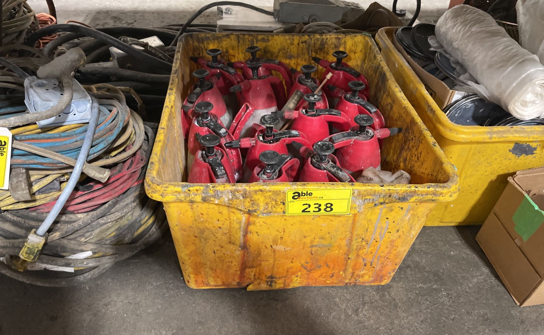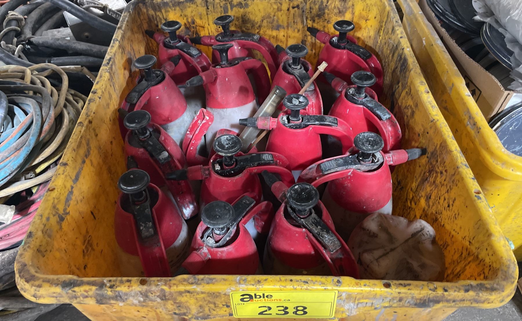 YELLOW PLASTIC BIN OF ASSORTED INDUSTRIAL HAND HELD CHEMICAL SPRAYERS *BIN INCLUDED*