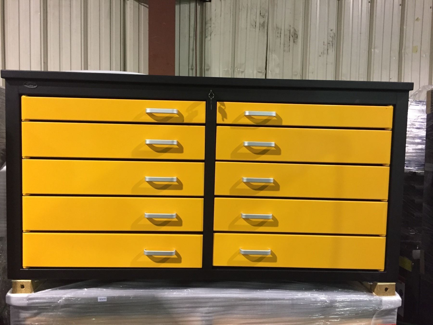 YELLOW STEELMAN 10 SWING DRAWER WORKBENCH H36" X W67" X D24" WITH ANTI-SLIP LINING LOCKING DRAWERS AND KEY, WITH 50KG CAPACITY PER DRAWER, MOBILE ON WHEELS