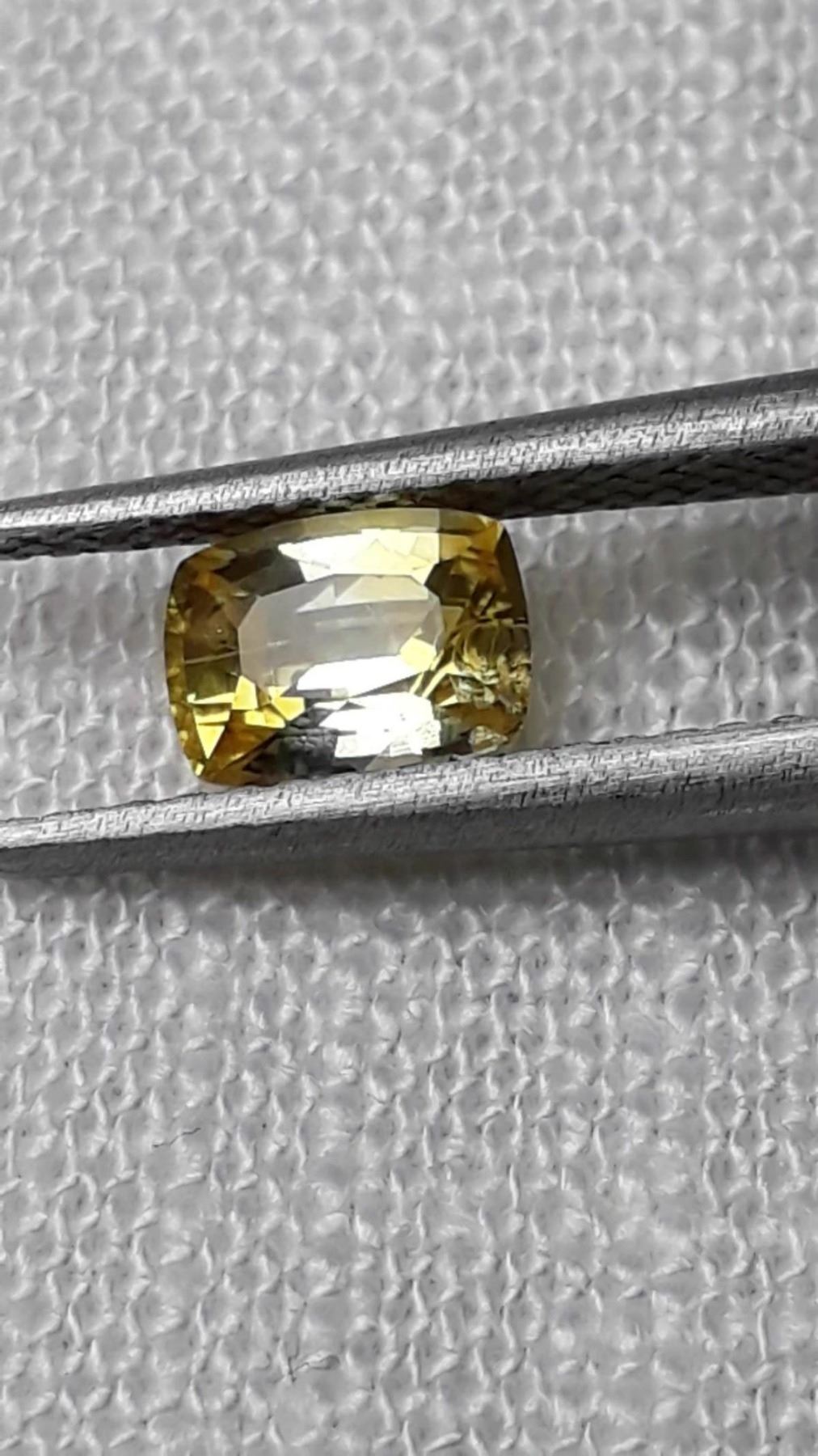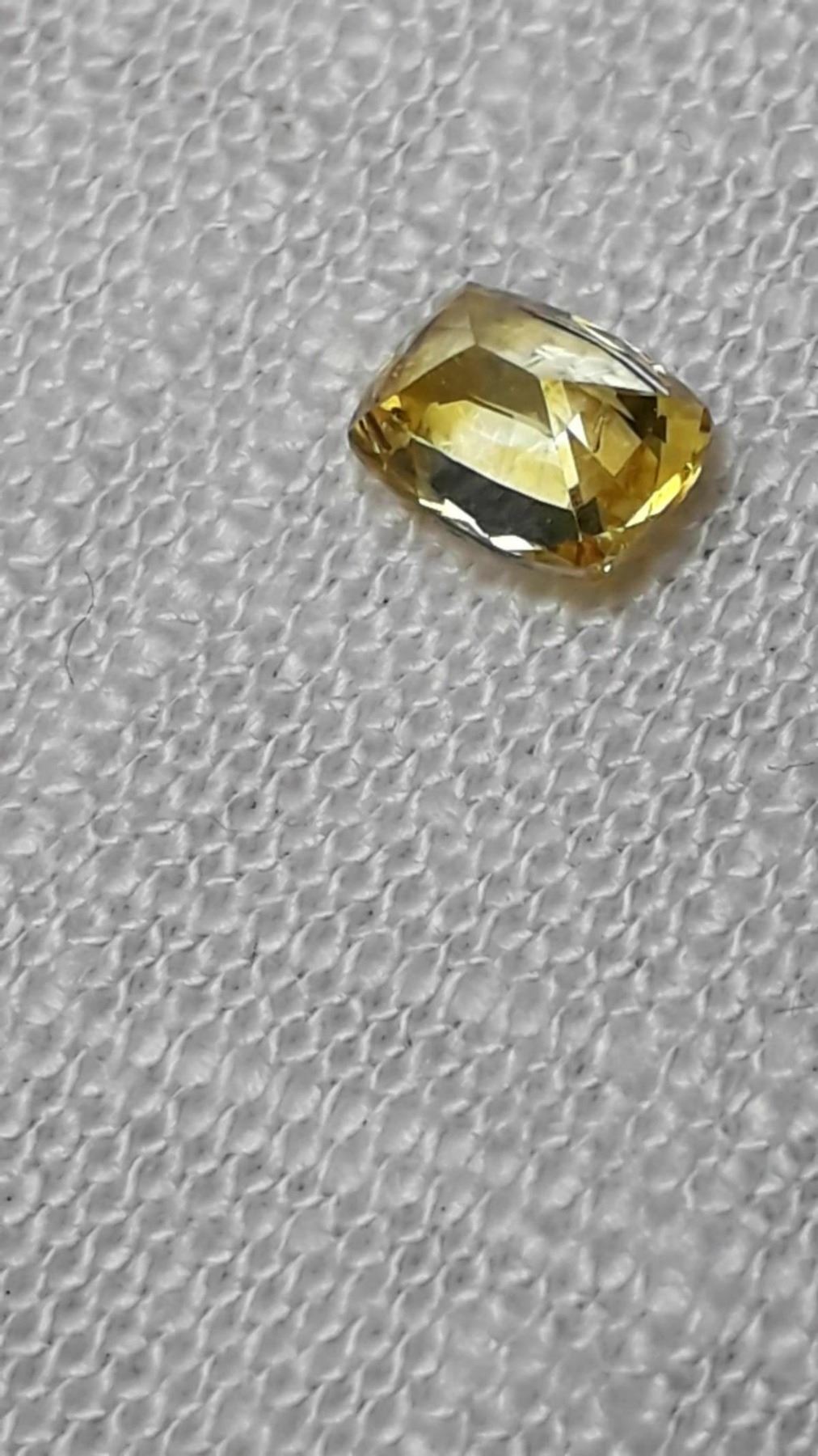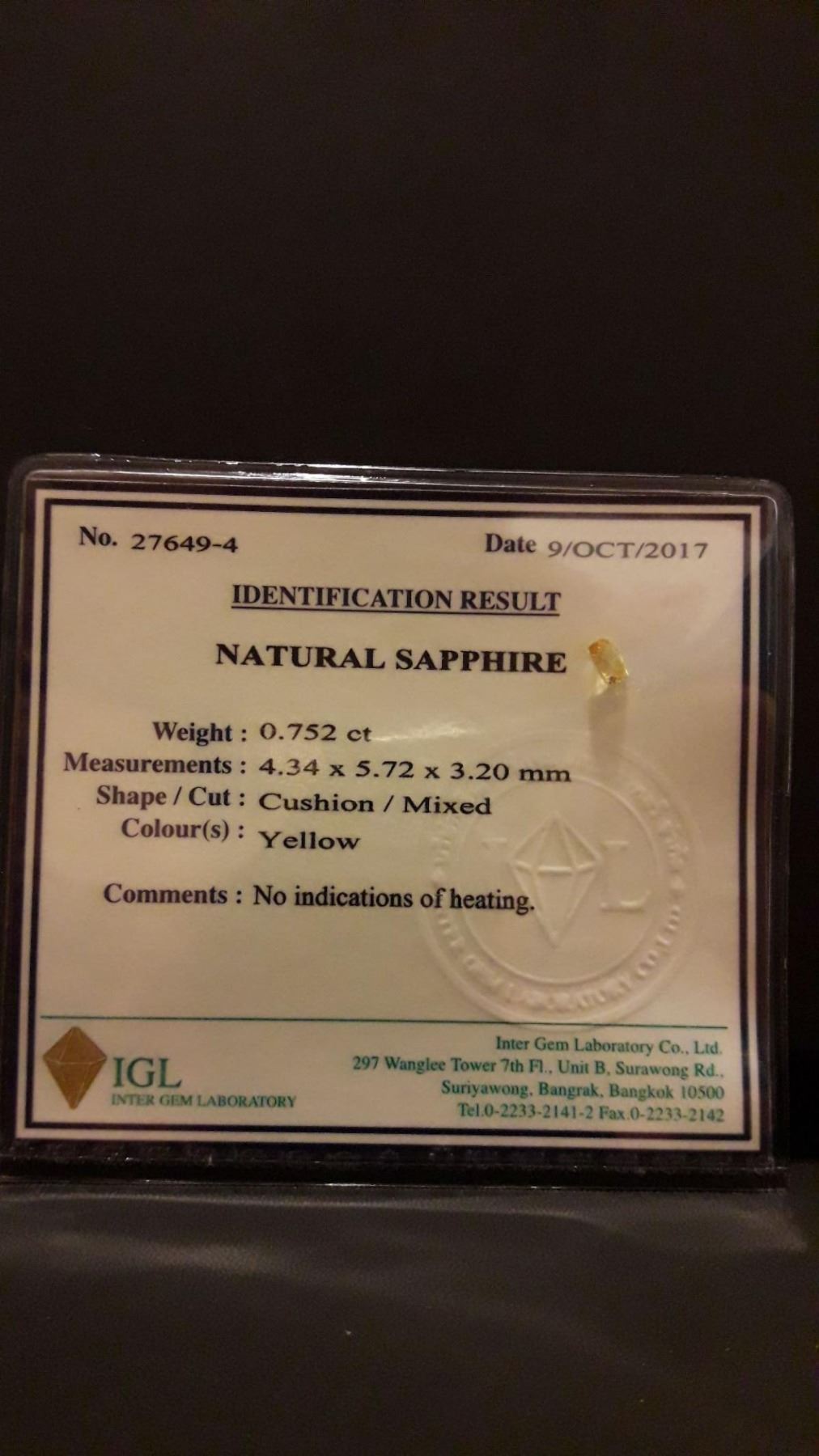 loose faceted precious sapphire, brand new without tags from Sri Lanka. GEMSTONE TYPE: Genuine Sri Lanka, Ceylon sapphireRECOMMENDED JEWELRY SETTINGS: Solitaire Ring, Women Rings, Sapphire solitaire, BraceletsCERTIFICATE: IGL/GIA Lab Brief included. Any other custom certificate paid by the buyerORIGIN: Sri LankaCARAT SIZE: 0.752DIMENSIONS: Length 4.34 x Width 5.72 x Depth 3.20 mmSHAPE/CUT: Premium cushion step cutTREATMENTS: None (No Enhancement)COLOR/COLOUR: YellowGIA COLOR CODE: Y/YCLARITY: VSSATURATION: 5=strongTONE: 4=mlFINISH & POLISH: very good