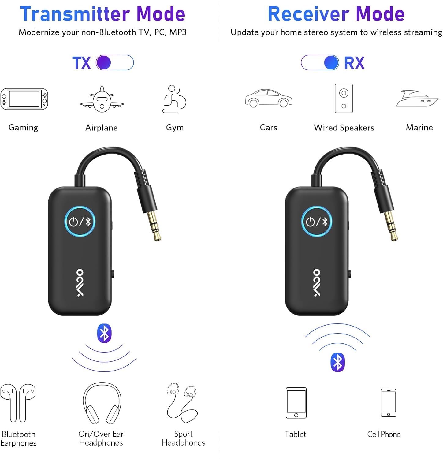 Plugs directly into any 3.5mm audio jack on any device and instantly gives you the ability to give it bluetooth to enable your own wireless bluetooth headphones or audio.