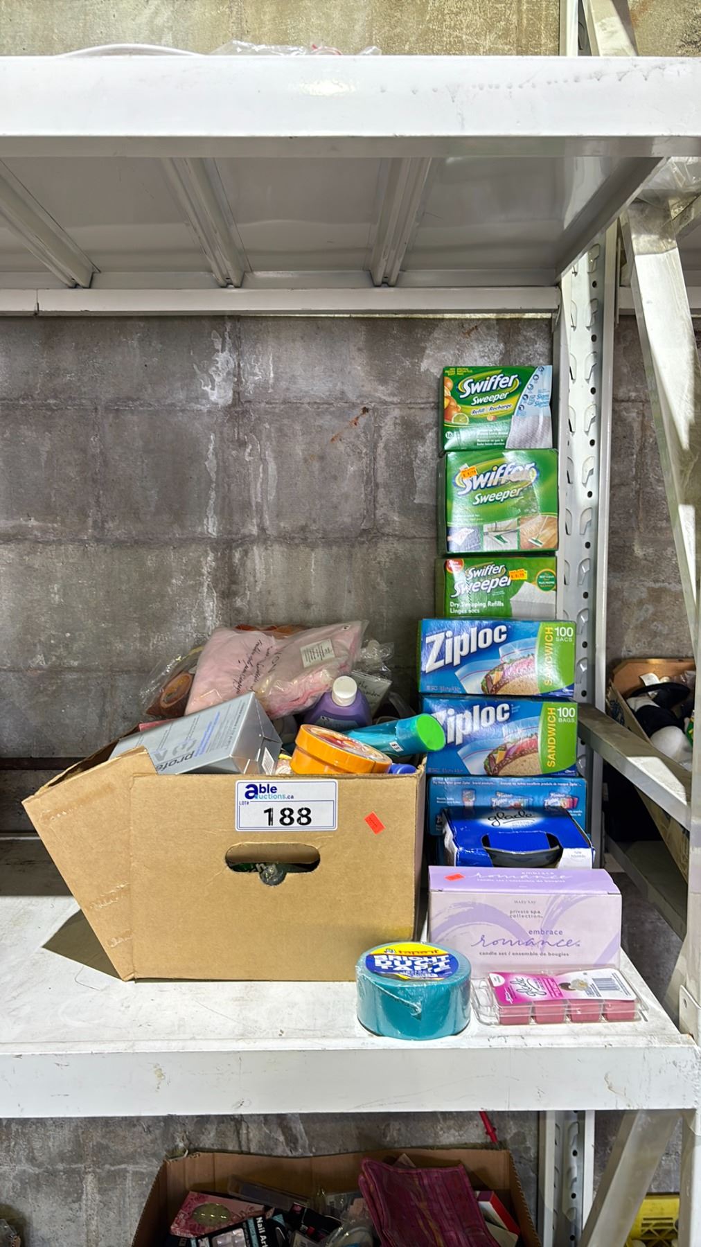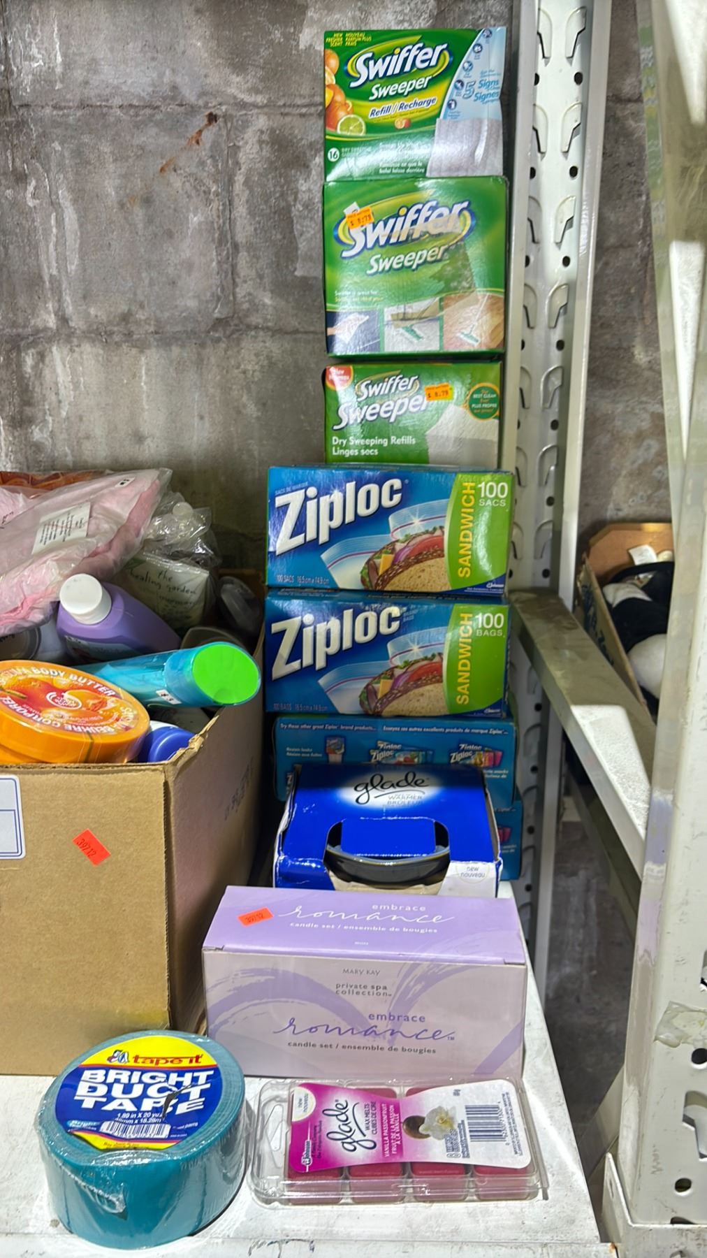 ZIPLOC BAGS, SWIFFER REFILLS, CANDLE SET, GLADE WAX & WARMER, BOX OF BODY BUTTER, LOTIONS, SHAMPOO, SOAP