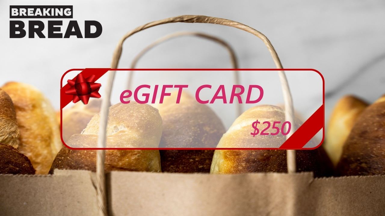 eGift Card from your favorite restaurant, Breakfast, lunch and dinners are made easier with this e-Gift Card. Choose your favorite restaurant from over 100 participating brands of Breaking Bread, including 2 Guys with Knives, Brix & Mortar, Field & Social, Freshbowl, SMAK, The Five Point, Earnest Ice Cream, Cartems Donuts, and more! The eGift Card can be used to order online or in-store. Value: $250, Generously donated by: Shelley McArthur