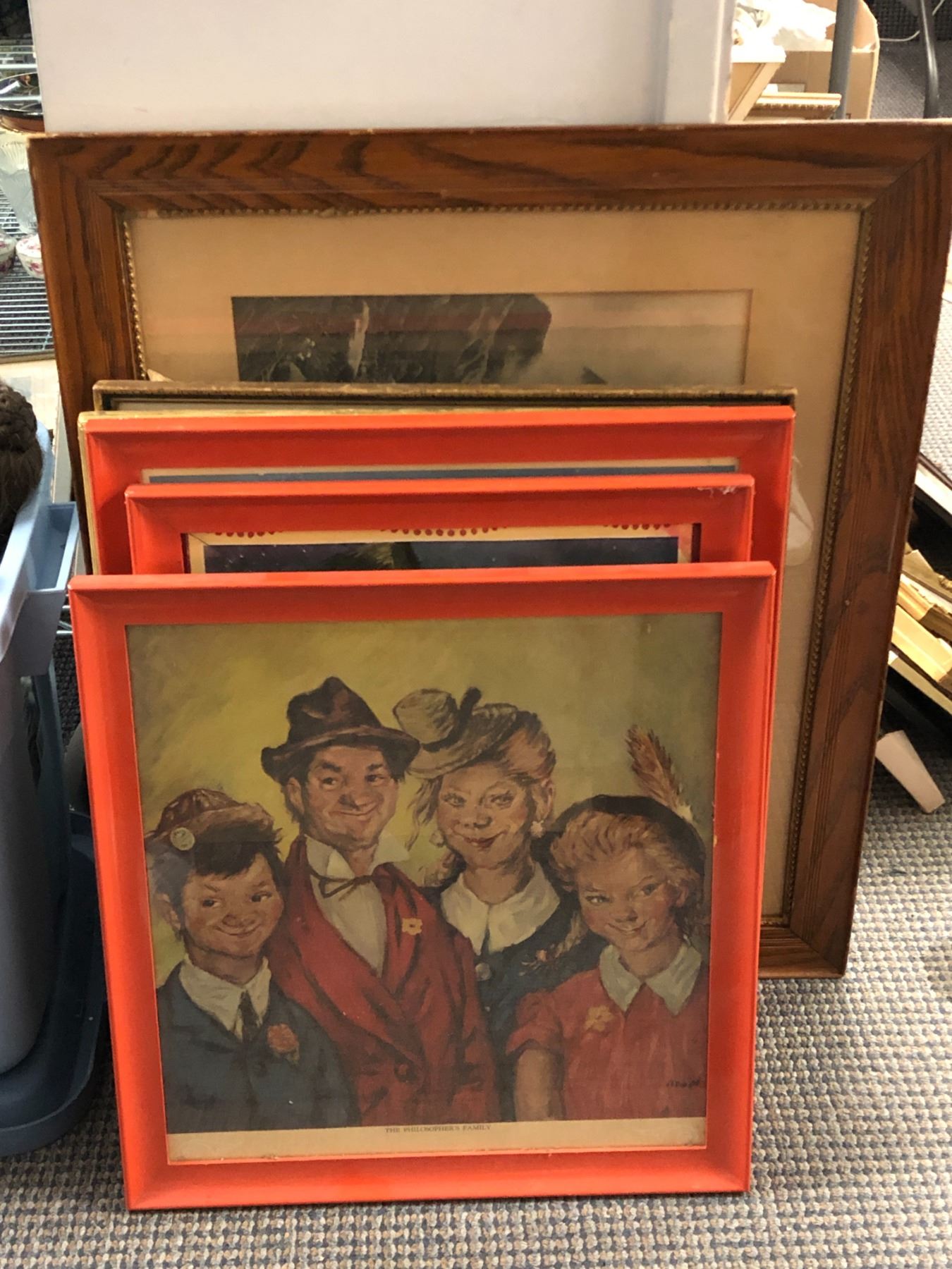 group of 8 assorted vintage estate prints - includes kittens watching mouse / framed philosopher Henry major print etc