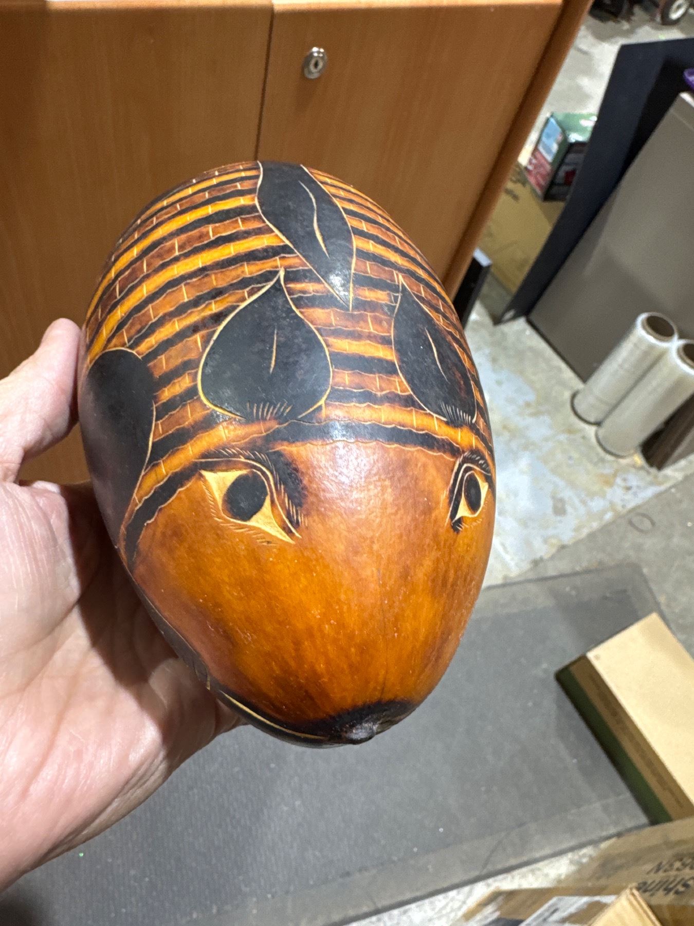 hand-carved gourd rattle, also known as a guiro or huiro