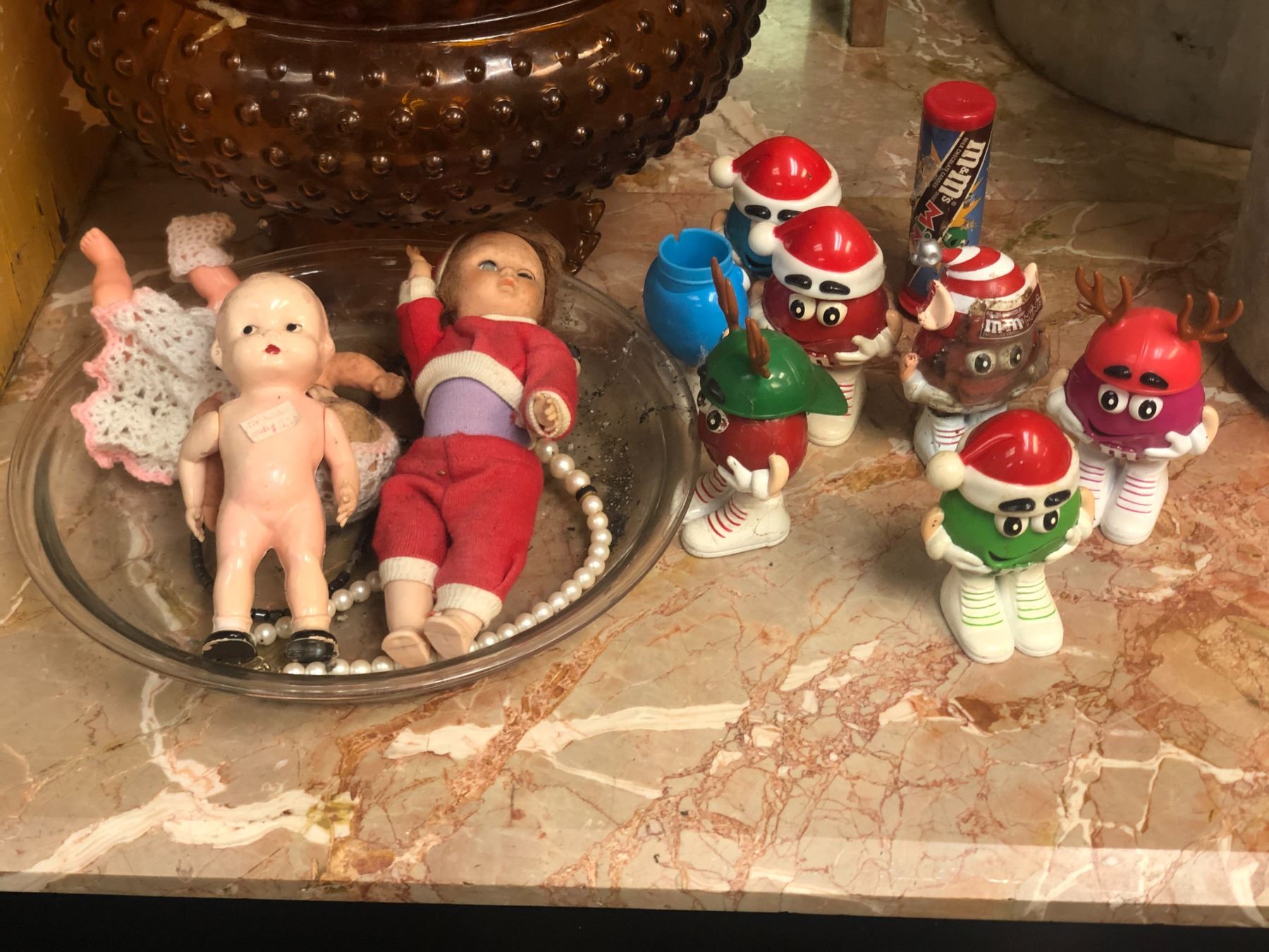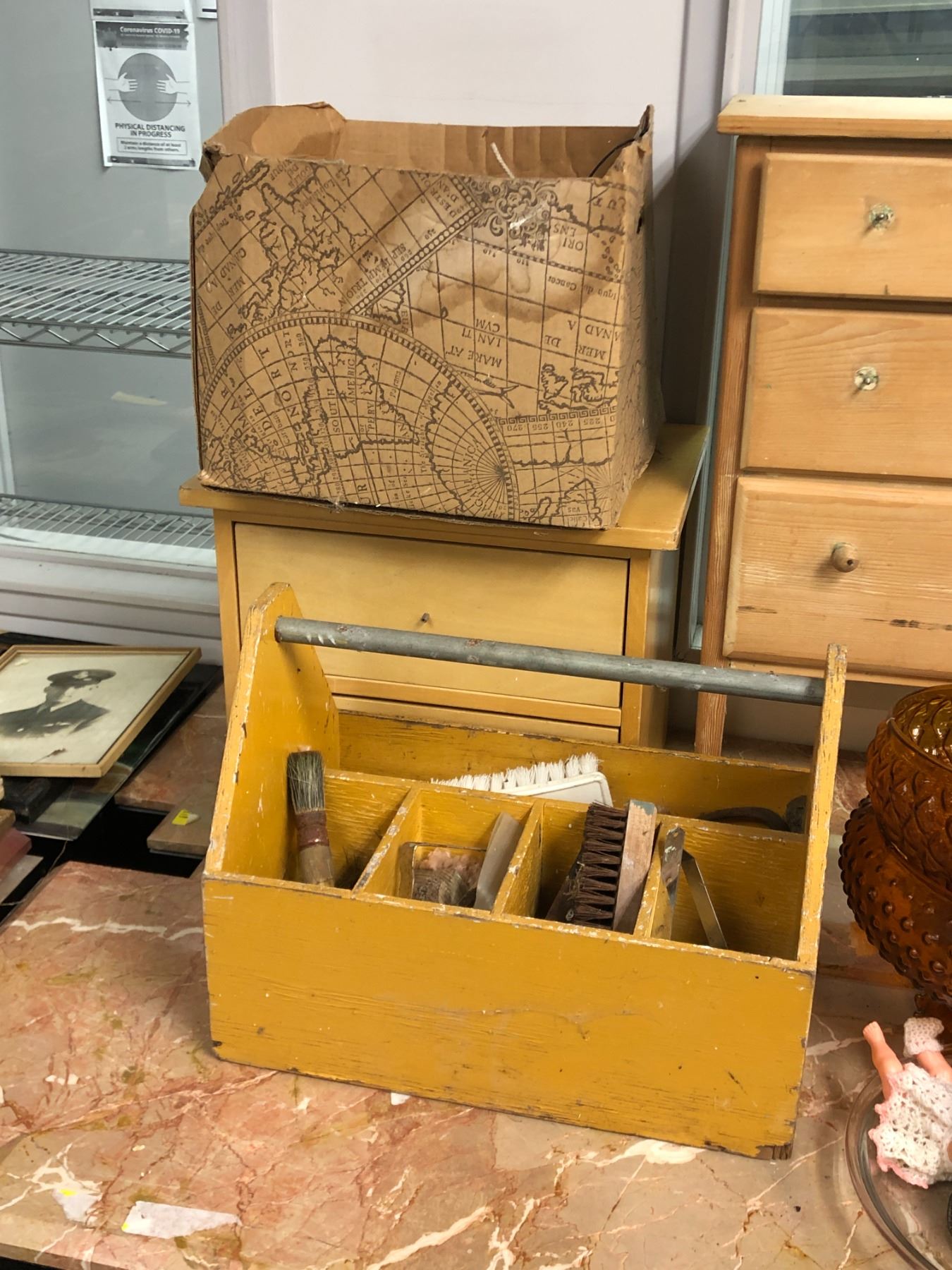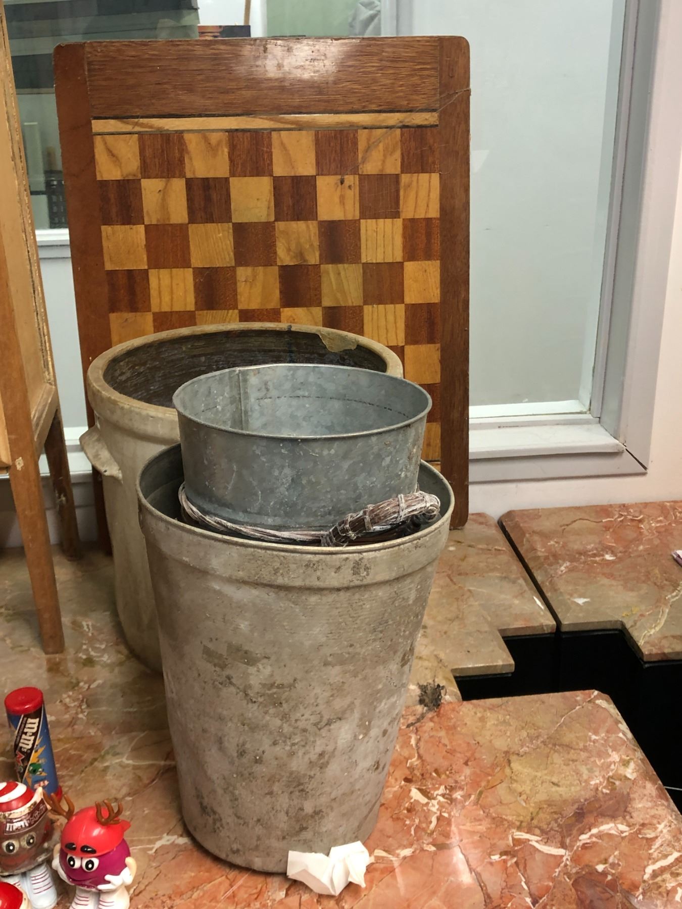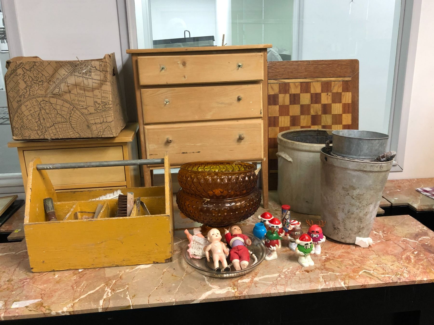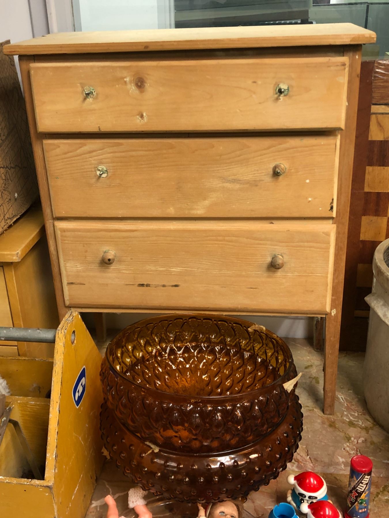 large group of vintage estate items - includes 3 drawer dresser / pie dish / glass decorative bowl / galvanized metal buckets etc