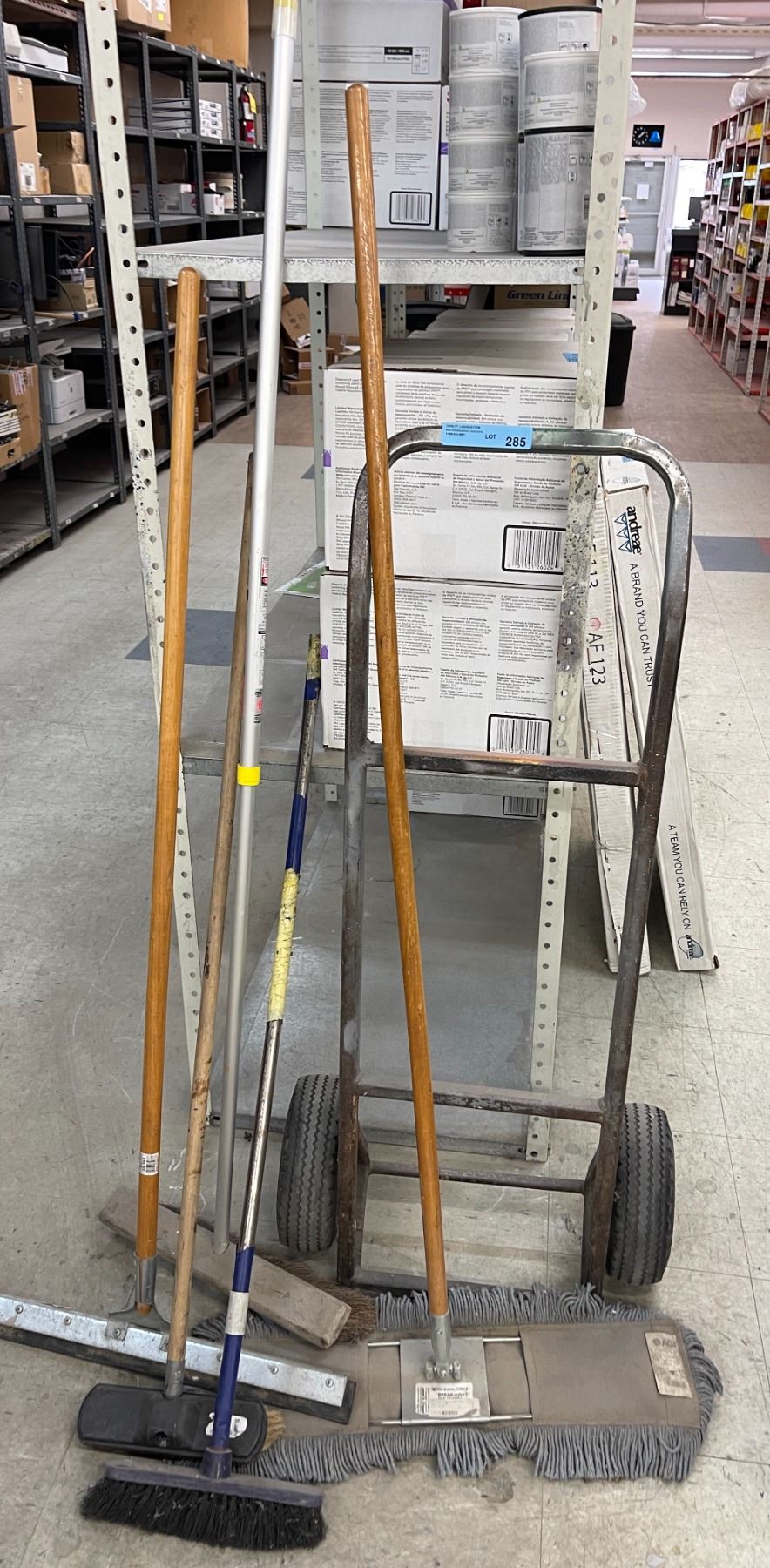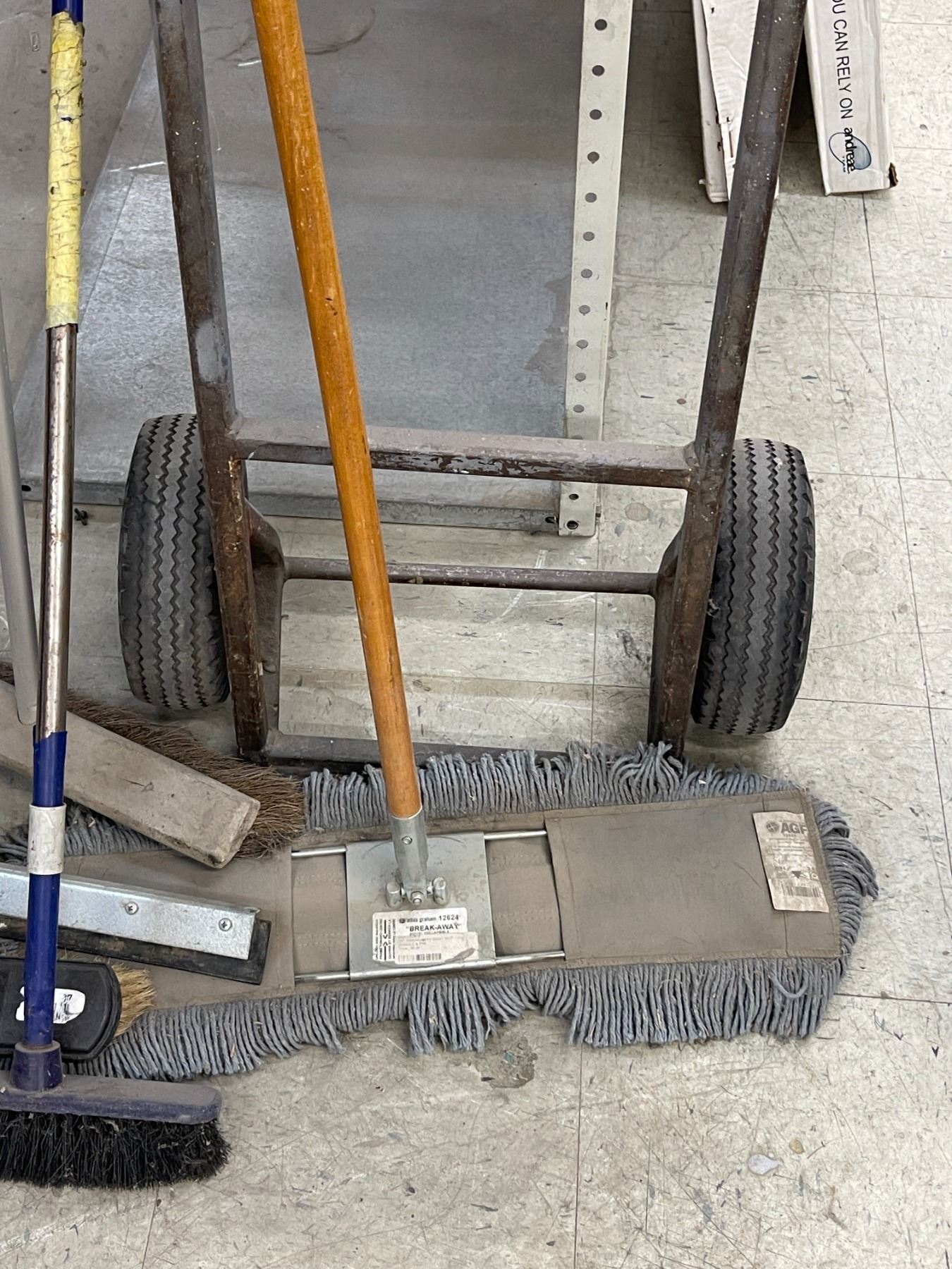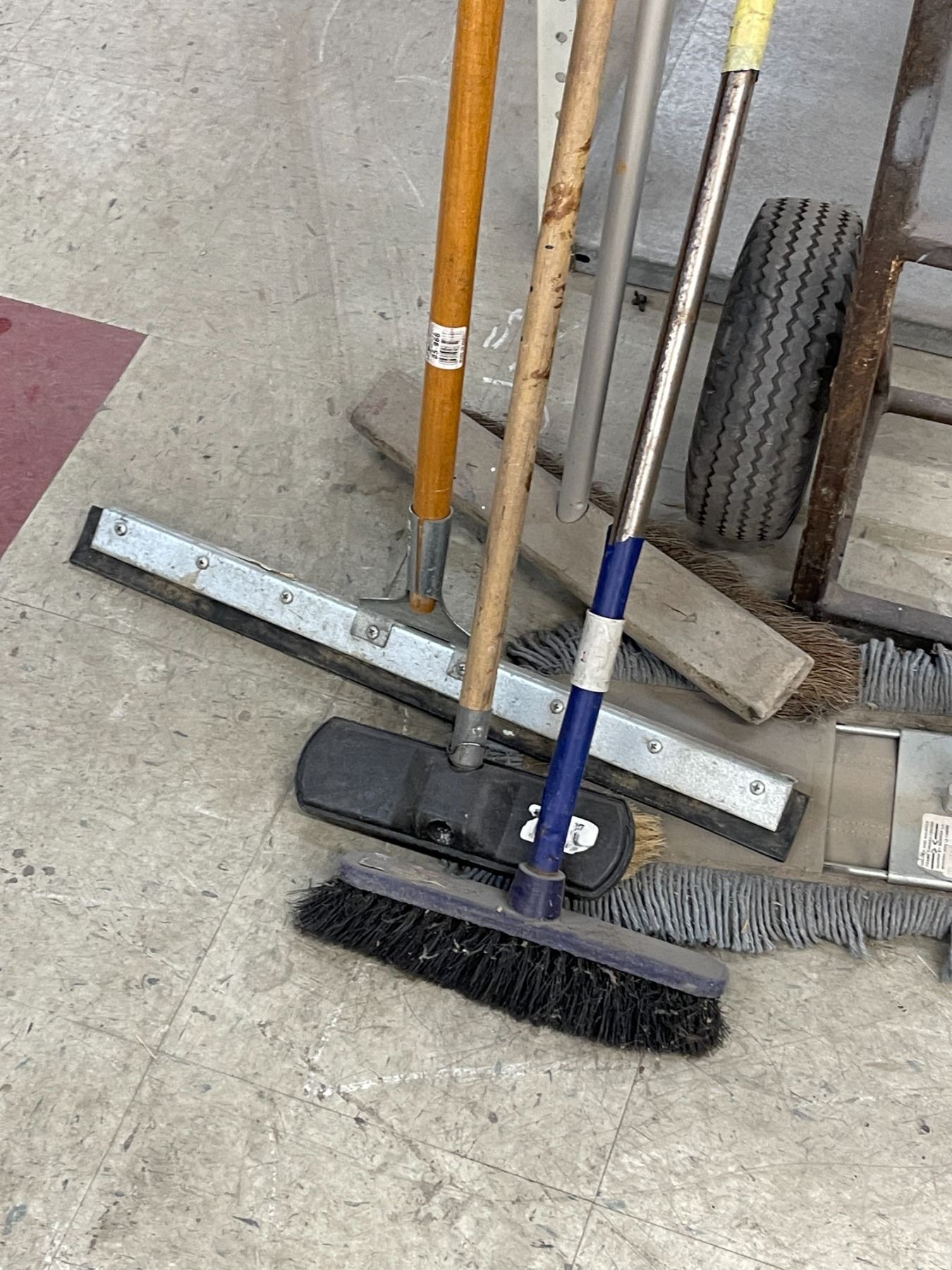 misc. lot of brooms, floor sweeper, floor squeegee and a 2 wheel dolly