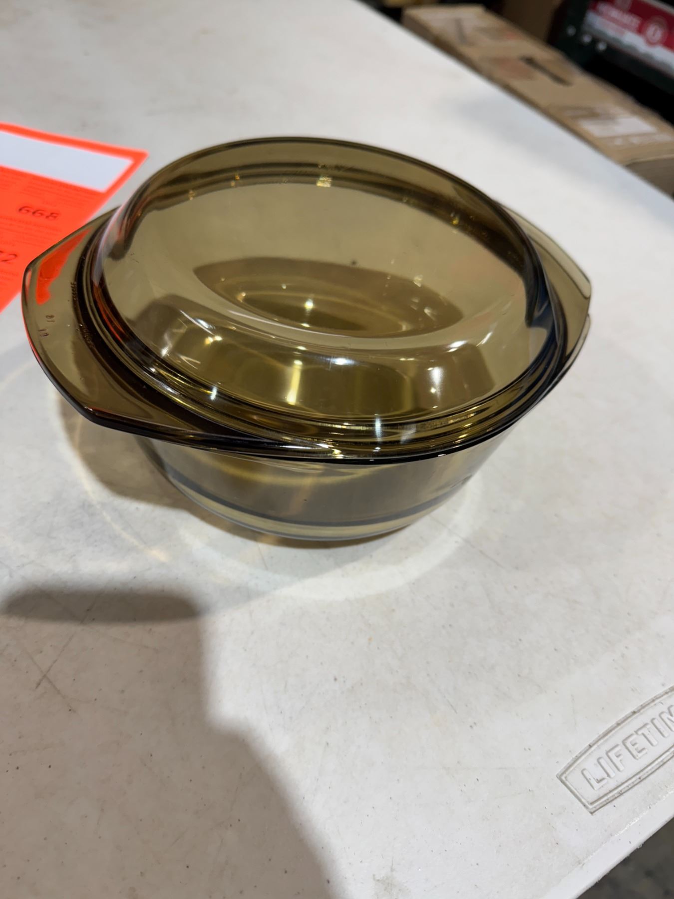 vintage Arcopal France brown glass oven dish with a lid, a mid-century modern design from the 1960s.