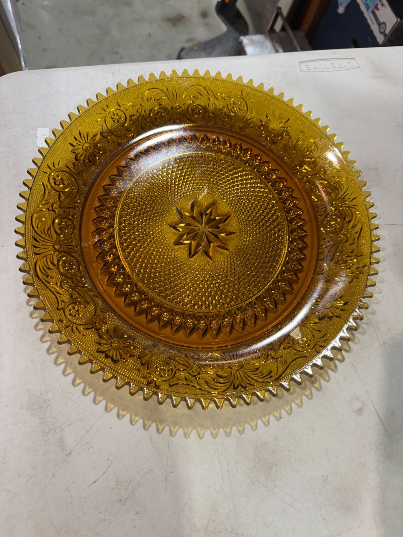 vintage amber glass serving platter made by Indiana Glass for Tiara Exclusives. It is in the "Sandwich" pattern, which was produced from the 1970s to the 1990s.